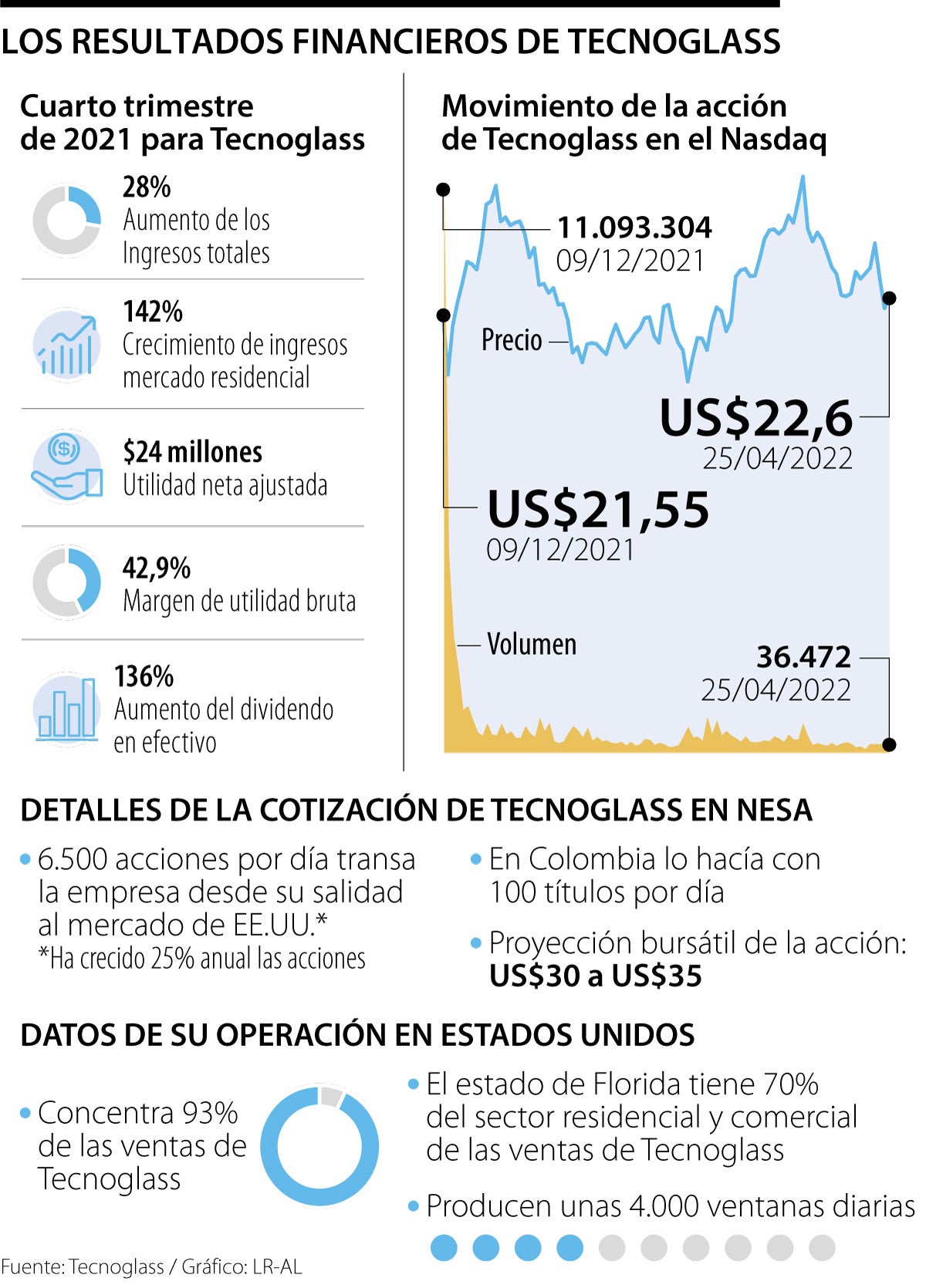 “Nosotros queremos llegar a los fondos de inversión privado y a los públicos de ahorro que hay en EE.UU., que son compradores a largo plazo y que quieren las acciones por los dividendos y por su crecimiento orgánico”, explicó Daes. En un informe, se reveló que los ingresos totales para 2021 de Tecnoglass aumentaron 31,9% a un récord de $496,8 millones frente a $376,6 millones en el año anterior. Para el cuarto trimestre del mismo año, estos ingresos aumentaron 28,0% a $131 millones. También es cierto que las acciones de Tecnoglass desde finales del año pasado han estado fluctuando no tan positivamente. Cayó 11,46% en diciembre de 2021 a US$18,66. Aun así, la acción ha estado por encima de US$20 en los últimos meses. Este año, la empresa espera facturar US$600 millones.
