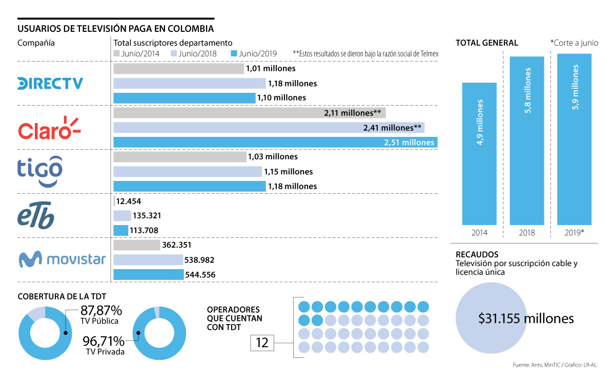 Mientras que en 2014 había 4,9 millones de usuarios en los distintos operadores de televisión, a junio de 2019 esta cifra ascendió a 5,9 millones según la Antv