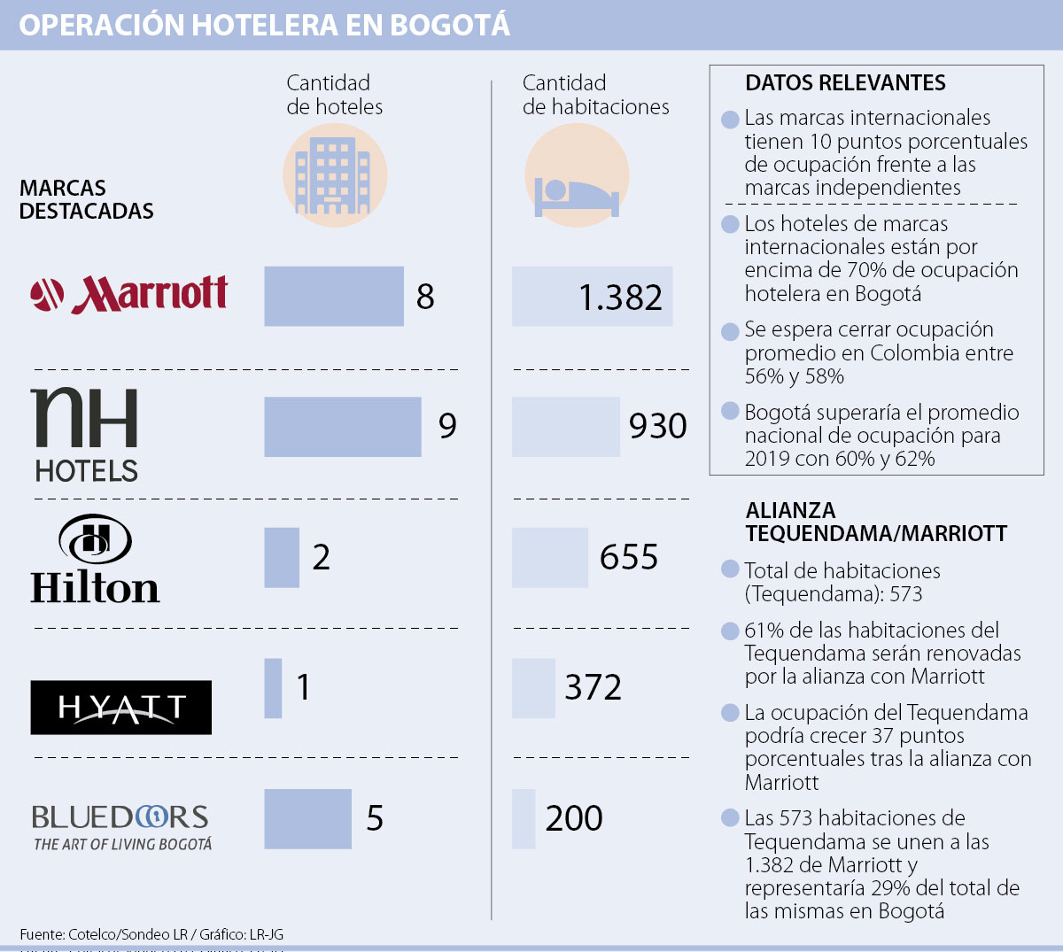 Además, la adición de este hotel al portafolio de Marriott International le permitiría al gigante hotelero llegar a nueve establecimientos en la capital del país. A su vez, las 1.382 habitaciones que tiene en la actualidad llegarían a 1.955 con las 573 del Tequendama, que pasarían a conformar 29% de la oferta de Marriott en Bogotá para el primer trimestre de 2021.