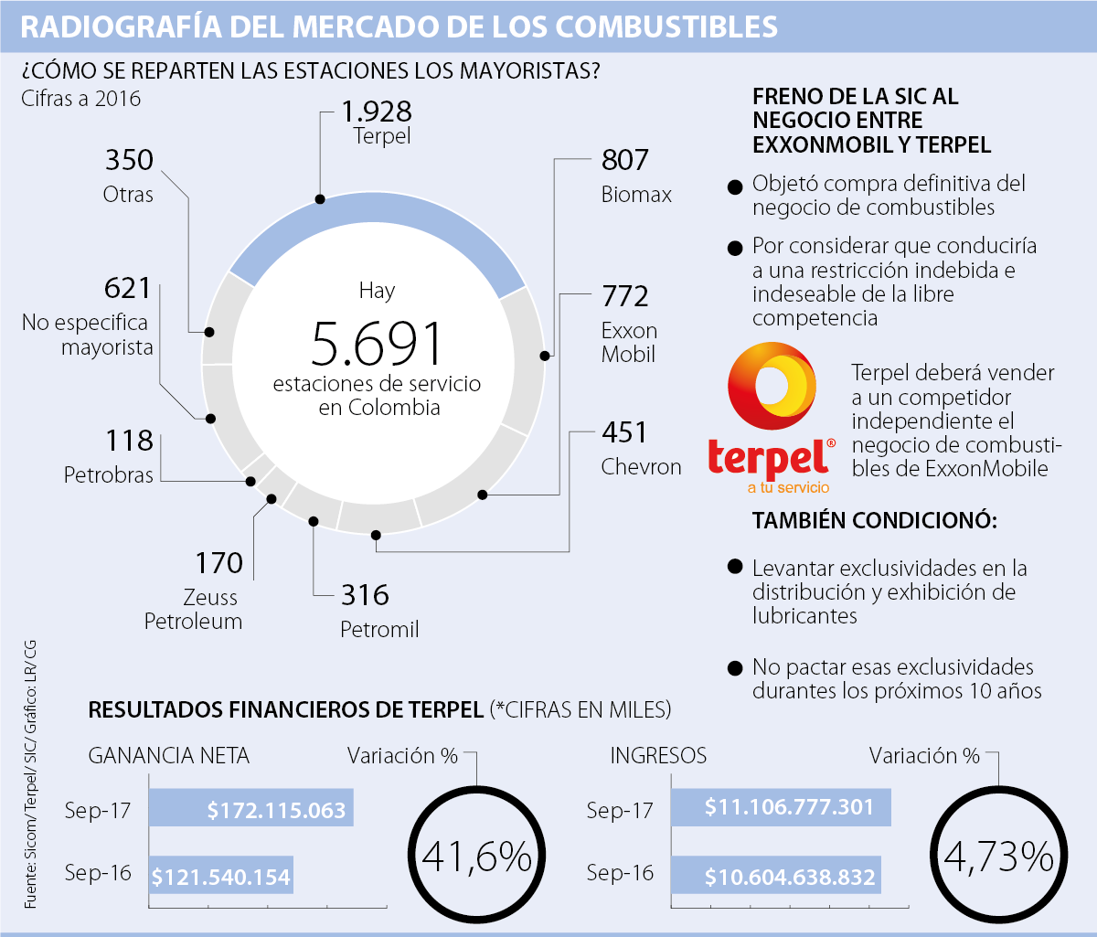Según el superintendente de Industria y Comercio, Pablo Felipe Robledo, este negocio “involucra dos segmentos o mercados: combustibles y lubricantes. Y se tomó la decisión porque la SIC no permitiría que al darse la operación Terpel obtuviera casi 64% en la distribución de los combustibles líquidos, y abasteciera a 54% de las estaciones de servicio del país porque se daría una posición cercana a dominante en el mercado”.