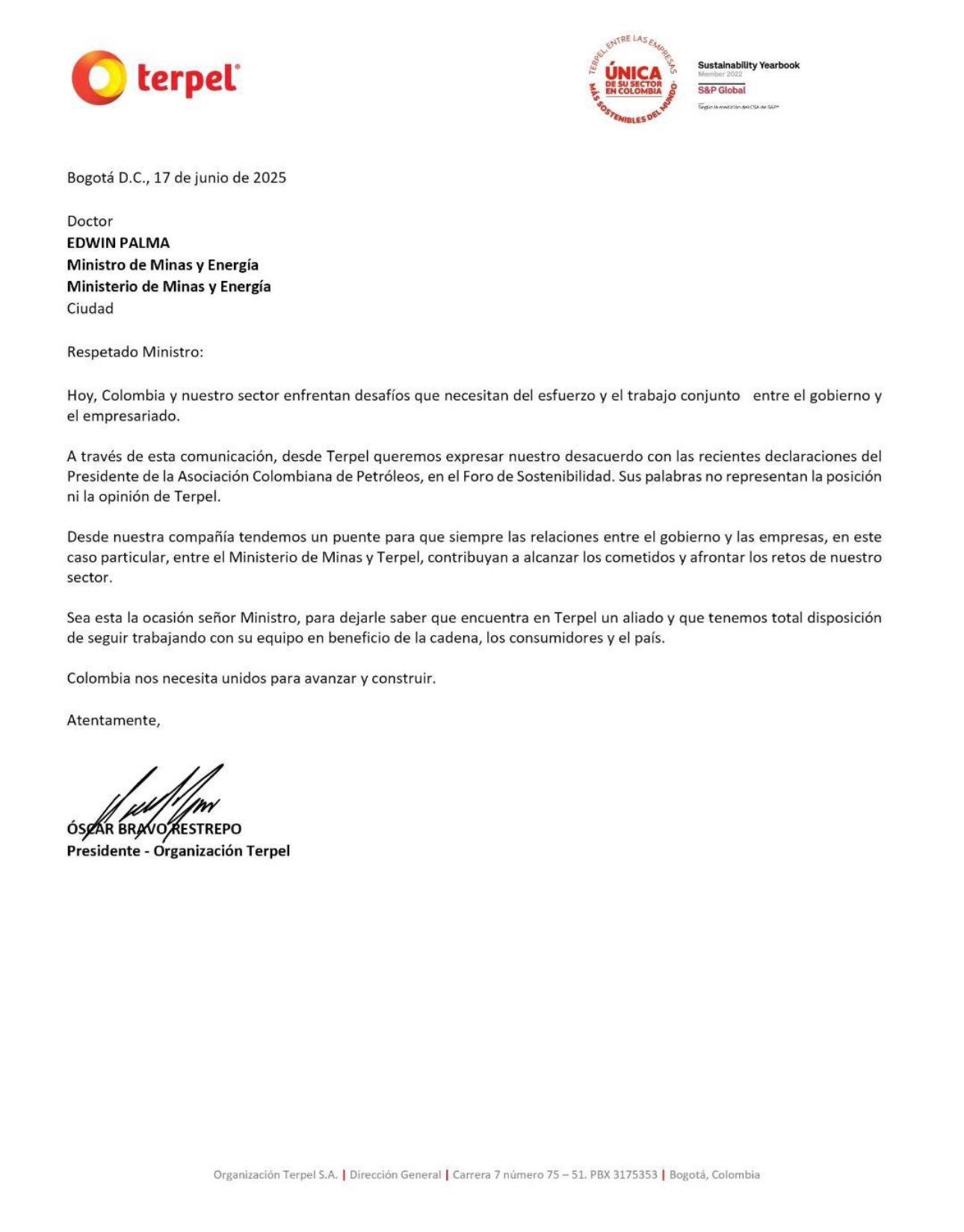 "A través de esta comunicación, desde Terpel queremos expresar nuestro desacuerdo con las recientes declaraciones del presidente de la Asociación Colombiana de Petróleos, en el Foro de Sostenibilidad. Sus palabras no representan la posición ni la opinión de Terpel", dice la carta de Bravo enviada al ministro de Minas y Energía, Edwin Palma.