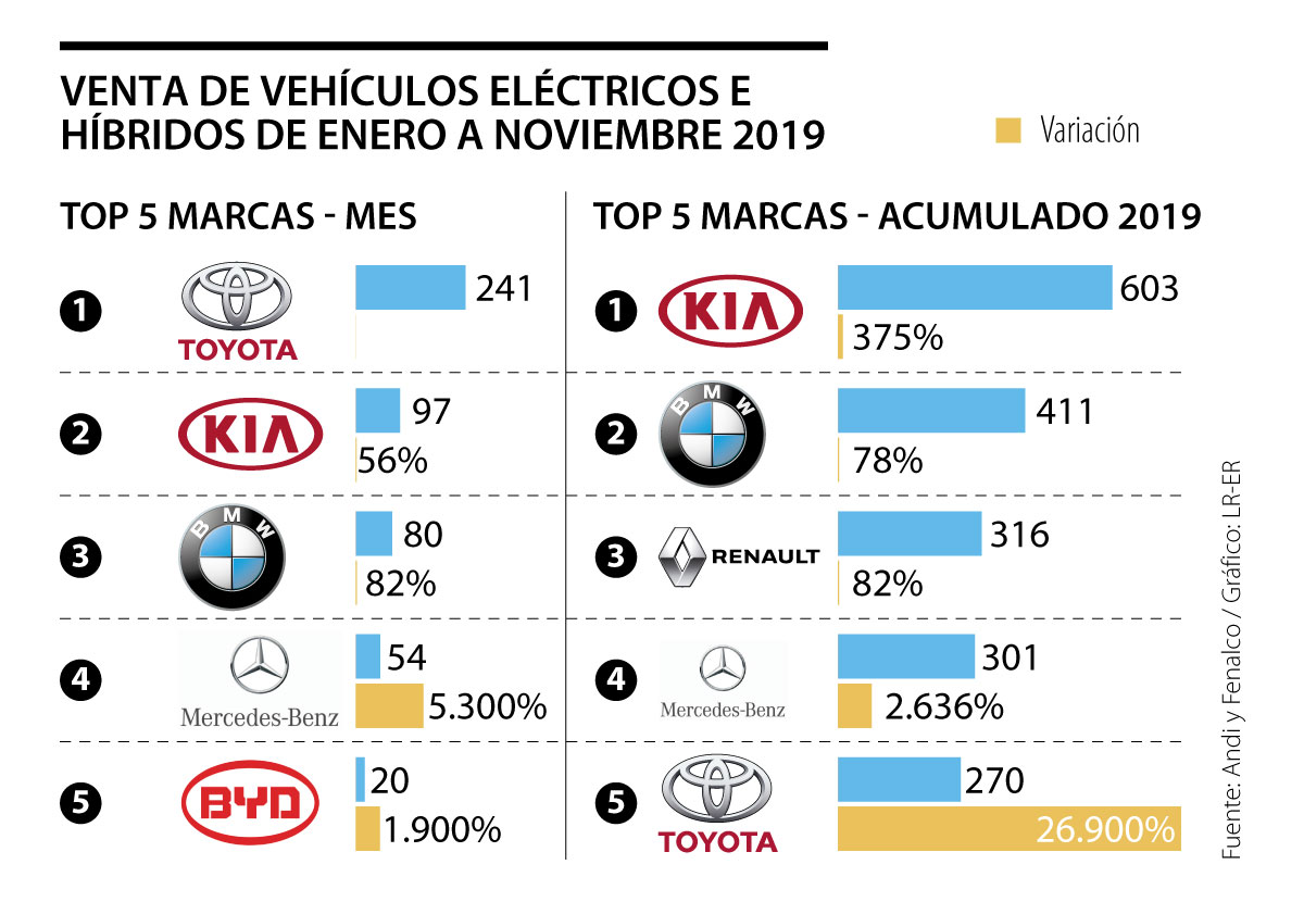 El último informe de Fenalco y la Andi a noviembre para el segmento de vehículos eléctricos e híbridos mostró un crecimiento de las matrículas de 253% frente al mismo período del año anterior, pasando de 704 unidades matriculadas (310 vehículos eléctricos y 394 híbridos) al mes 11 de 2018 a 2.486 vehículos matriculados en lo corrido de este año; de los cuales 782 son eléctricos y 1.704 híbridos.