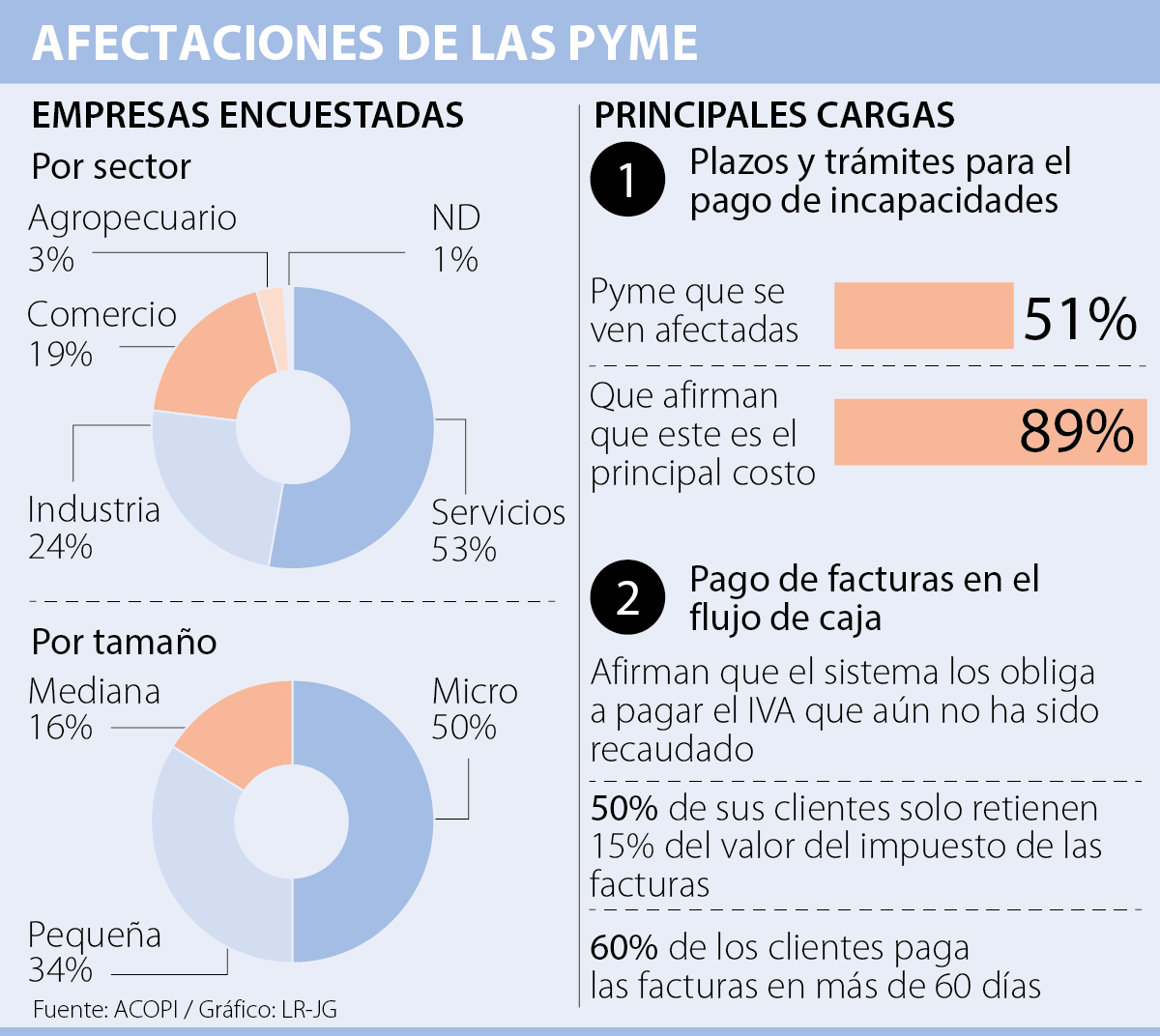 En el estudio realizado se identificó que la diversidad de plazos y trámites para el pago de incapacidades y el impacto de los largos periodos de pago de facturas en el flujo de caja de las Pyme son las que tienen un mayor efecto, pues 89% de estas pequeñas y medianas empresas señalan como principal costo laboral los procesos que incluyen las incapacidades.