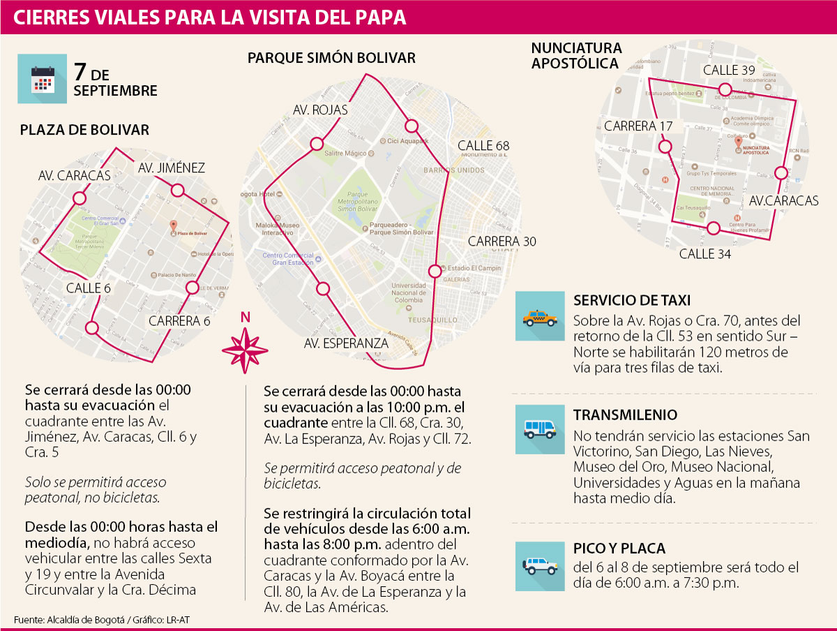 Así mismo, las estaciones de Transmilenio de San Victorino, Las Nieves, San Diego, Museo Nacional, Universidades, Las Aguas y Museo del Oro estarán cerradas, mientras que el Obispo de Roma cumple su itinerario en cercanías al centro y el nororiente de la capital.