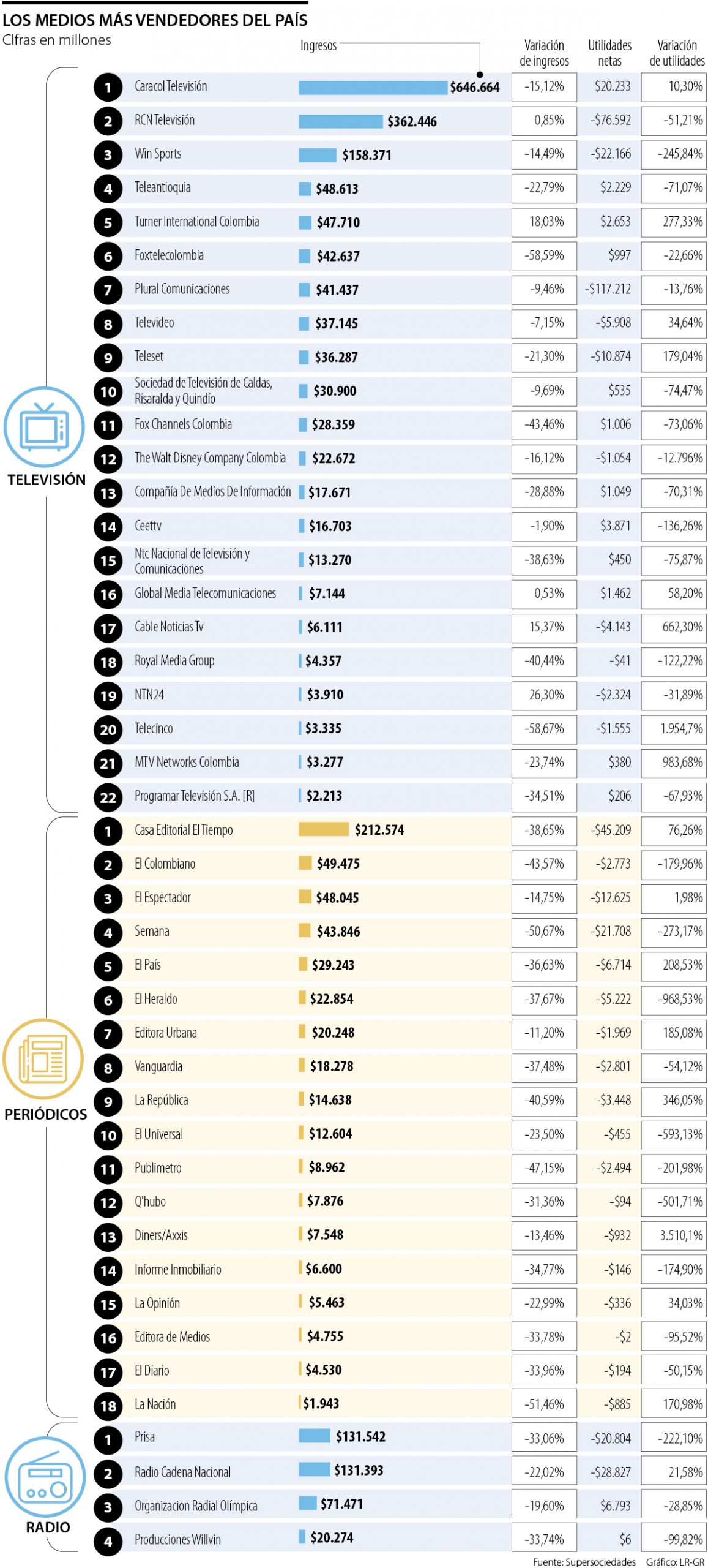 Los tres canales más grandes son Caracol Televisión, RCN Televisión y Win Sports. Estos tres mostraron ingresos de $1,1 billones. Por su parte, las dos cadenas radiales más grandes son Prisa y RCN, cuyo ingresos fueron de $262.935 millones, mientras que, el impreso más grande fue El Tiempo, con $212.574 millones en ventas. De esta forma, las seis empresas periodísticas más grandes sumaron $1,6 billones, es decir que cuentan con dos tercios del mercado total.