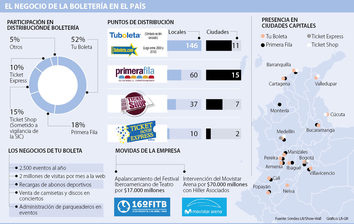 Según los reportes del sector calculados por Show-Wall, Tu Boleta tiene 52% de la venta de tickets, le sigue Primera Fila, marca de Cine Colombia, con 18%; Ticket Shop, con 15% (que aún continúa sometida a vigilancia especial por parte de la Superintendencia de Industria y Comercio por el escándalo de partidos de la Selección Colombia); y en cuarta posición está Ticket Express, con 10%. Ese 5% restante lo disputan las demás empresas, que atienden principalmente eventos regionales.