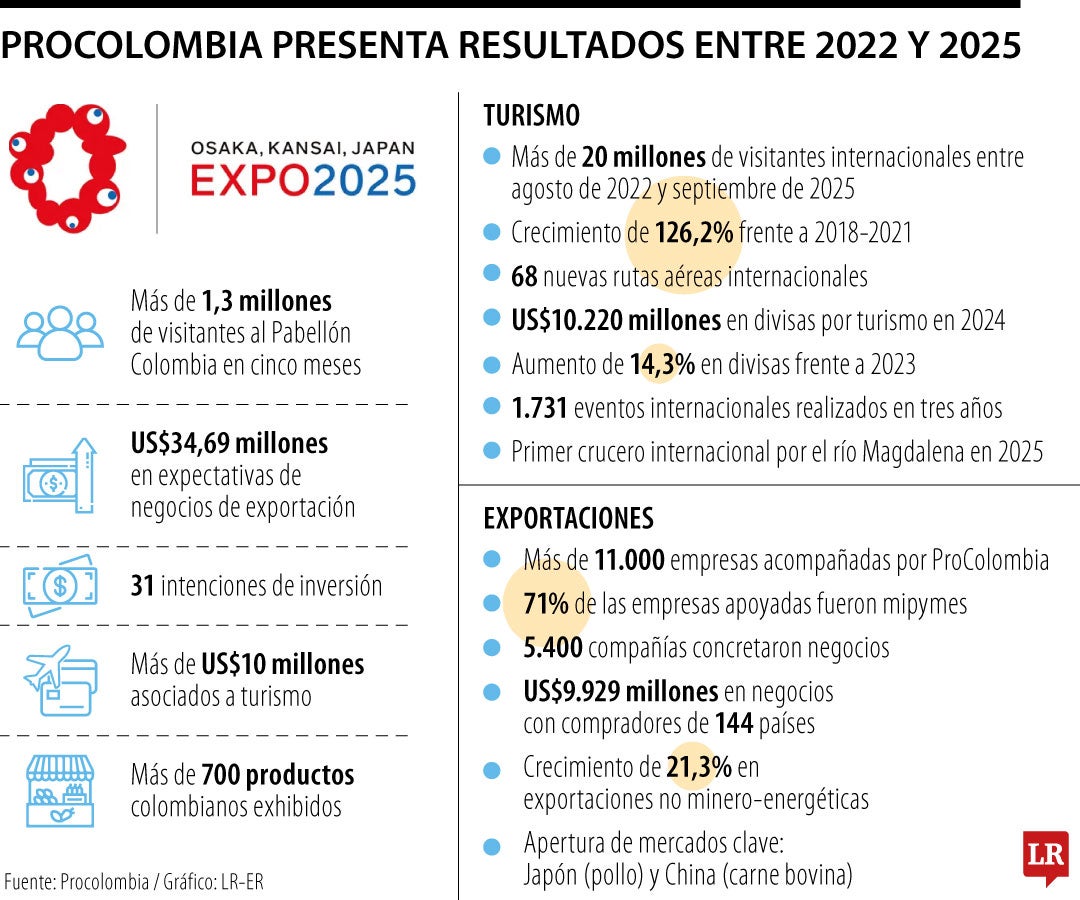 Uno de los momentos más visibles de esta estrategia fue la participación del país en la Expo Osaka 2025. En cinco meses, el Pabellón Colombia recibió más de 1,3 millones de visitantes y dejó expectativas de negocios de exportación por US$34,69 millones, además de 31 intenciones de inversión y más de US$10 millones asociados a turismo.
