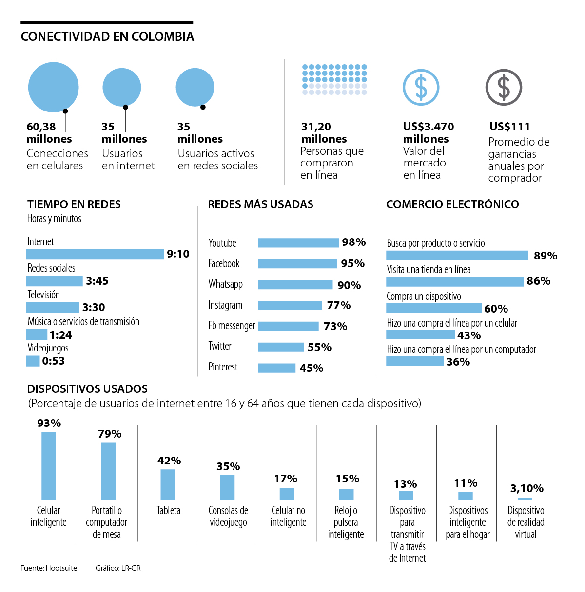 Los resultados de Hootsuit revelaron que 93% de los usuarios entre 16 y 64 años tienen un celular inteligente y 17% tiene un celular que no cuenta con esta tecnología; asimismo, 79% cuenta con un computador de mesa o un portátil, 35% de los colombianos tiene una consola de videojuegos y solo 3,1% tienen dispositivos de realidad virtual.