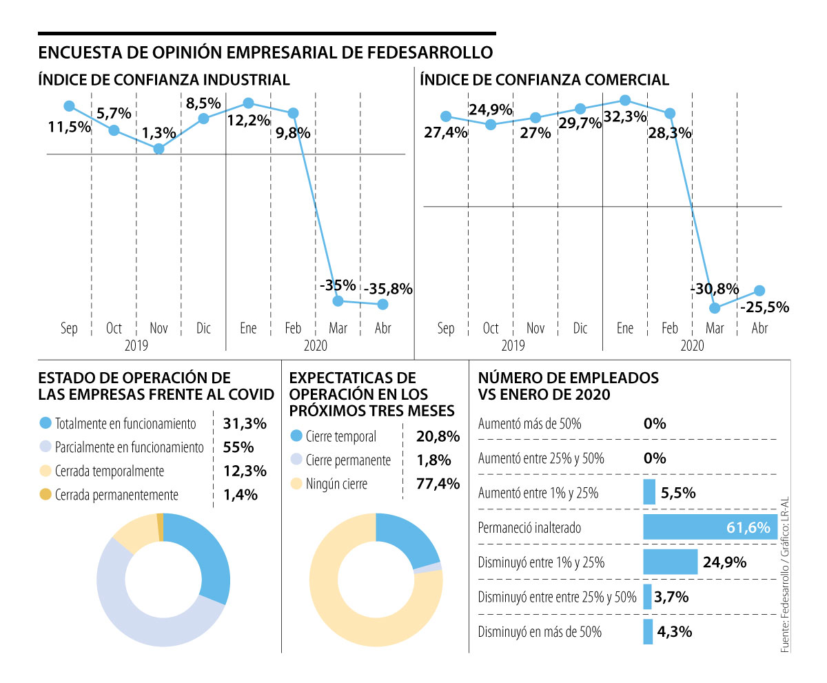 La confianza de los sectores comercial e industrial siguió mostrando negativismo en abril a causa del covid-19, según las cifras reveladas por la Encuesta de Opinión Empresarial (EOE) del Centro de Investigación Económica y Social (Fedesarrollo). Para esta edición, además, se presentó un módulo con las afectaciones que las empresas han tenido en su operación y contratación por cuenta de la pandemia y el aislamiento.