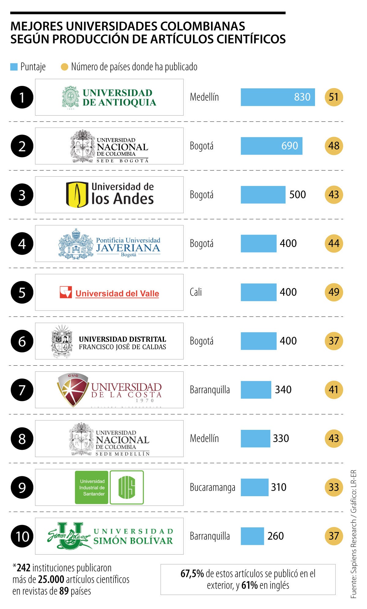 La Universidad Nacional de Colombia siguió en el ranking, con un puntaje de 690; el tercer lugar fue para la Universidad de los Andes, con 500 puntos; y el cuarto puesto correspondió a la Universidad Javeriana, con 400. Las tres instituciones de educación superior están localizadas en Bogotá y tuvieron una participación internacional de sus artículos científicos en 48, 43 y 44 países, respectivamente.
