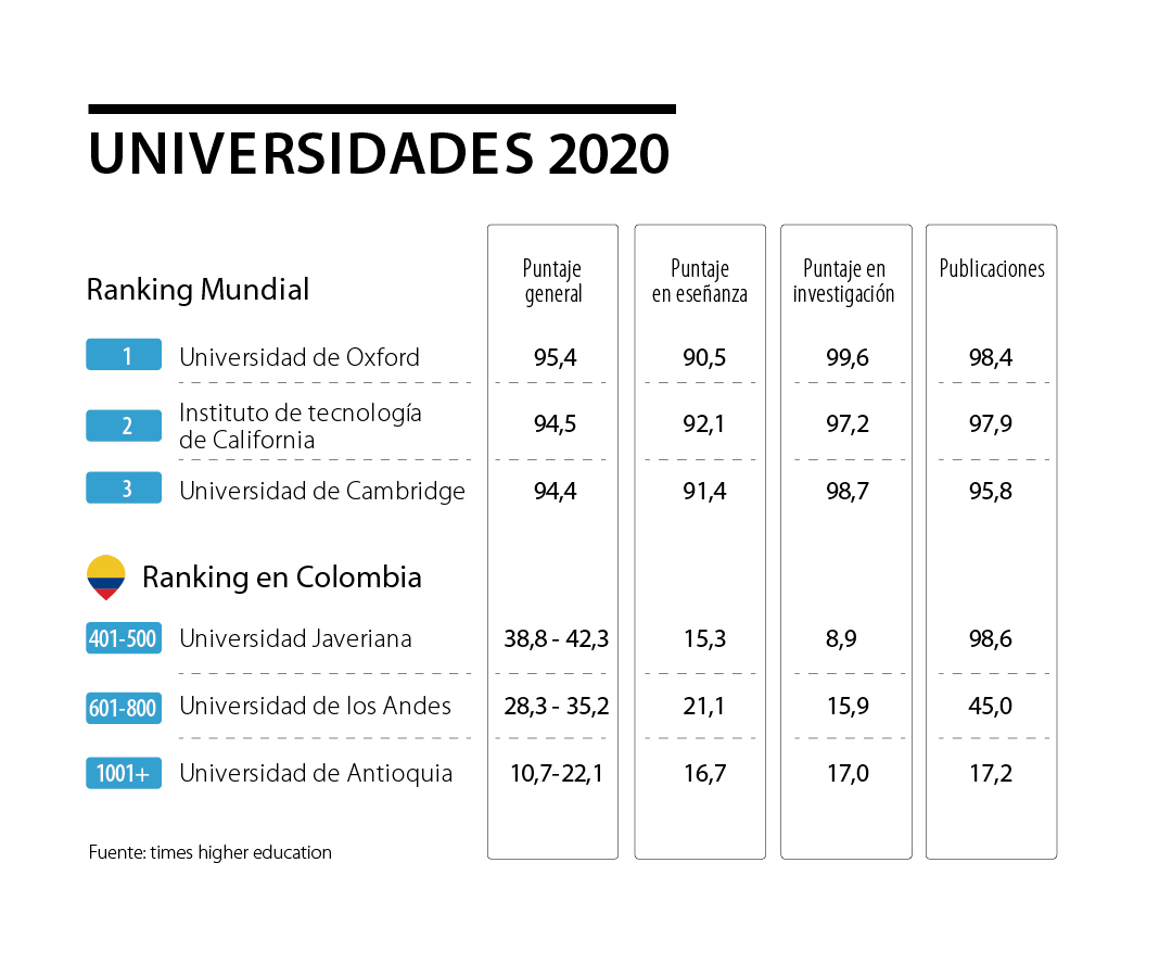 A nivel mundial, la Universidad de Oxford ocupó el primer puesto, seguido de la Universidad de tecnología de California. En los primeros 20 lugares no se vieron universidades ni de América Latina ni de Colombia. Sin embargo, la revista destacó que el país aumento el número de universidades dentro del ranking, pasando de tener siete a ocho actualmente.