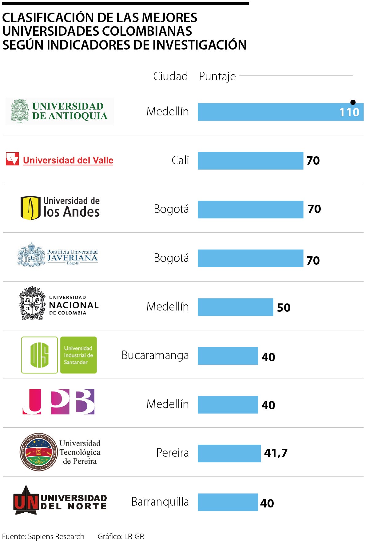 Este ranking, liderado por Carlos Roberto Peña Barrera y publicado desde 2011, fue el resultado de tres variables. El número total de revistas indexadas y categorizadas en A1, A2, B y C por el Índice Bibliográfico Nacional. También, del número de programas activos y que pueden recibir estudiantes nuevos para maestrías (o equivalentes) y doctorados de acuerdo al Ministerio de Educación Nacional-Snies. Por último, correspondiente a la cifra de grupos de investigación categorizados en A1, A, B y C por el Ministerio de Ciencias.