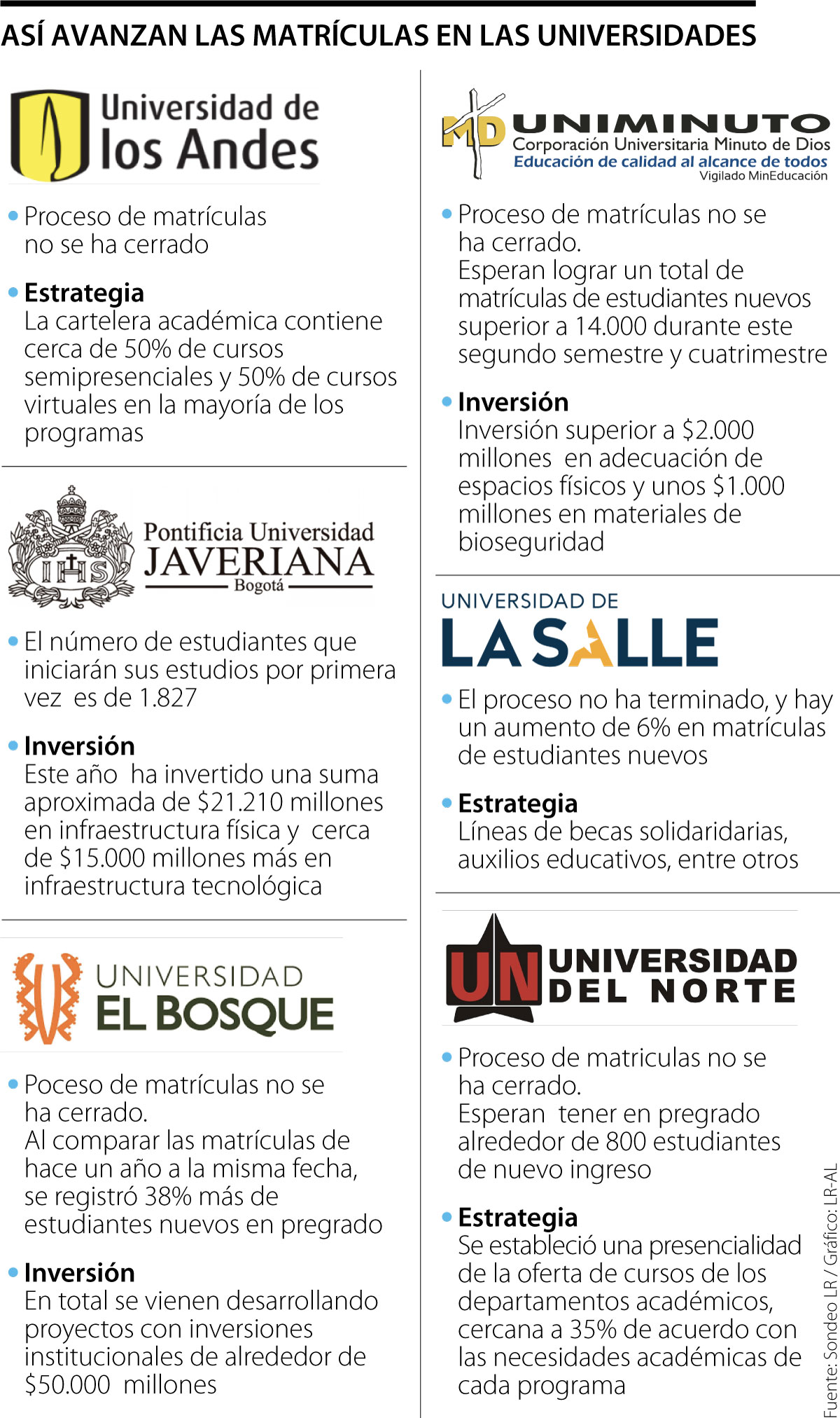 En Barranquilla, la Universidad del Norte señaló que, si bien siguen en un proceso de matrículas, las proyecciones se han cumplido de acuerdo con lo previsto por las directivas para el segundo semestre de 2021.