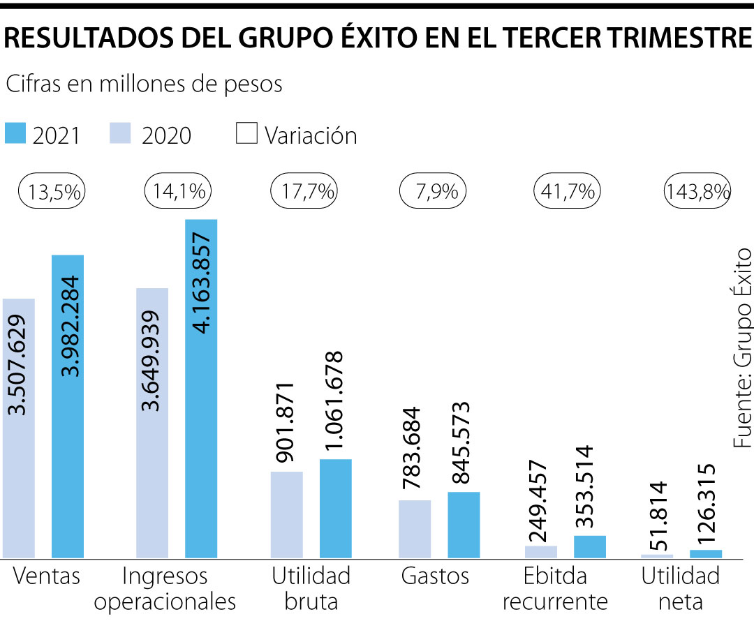 Durante el tercer trimestre, Grupo Éxito registró una utilidad neta consolidada de $126.315 millones, 143,8% más a la registrada el mismo período del año anterior, impulsada por el crecimiento fuerte del ingreso y la optimización de los niveles de costos y gastos. El Grupo registró un Ebitda recurrente consolidado de $353.514 millones con un margen de 8,5%, gracias al crecimiento fuerte de la venta del negocio retail y la contribución de los negocios financiero e inmobiliario.