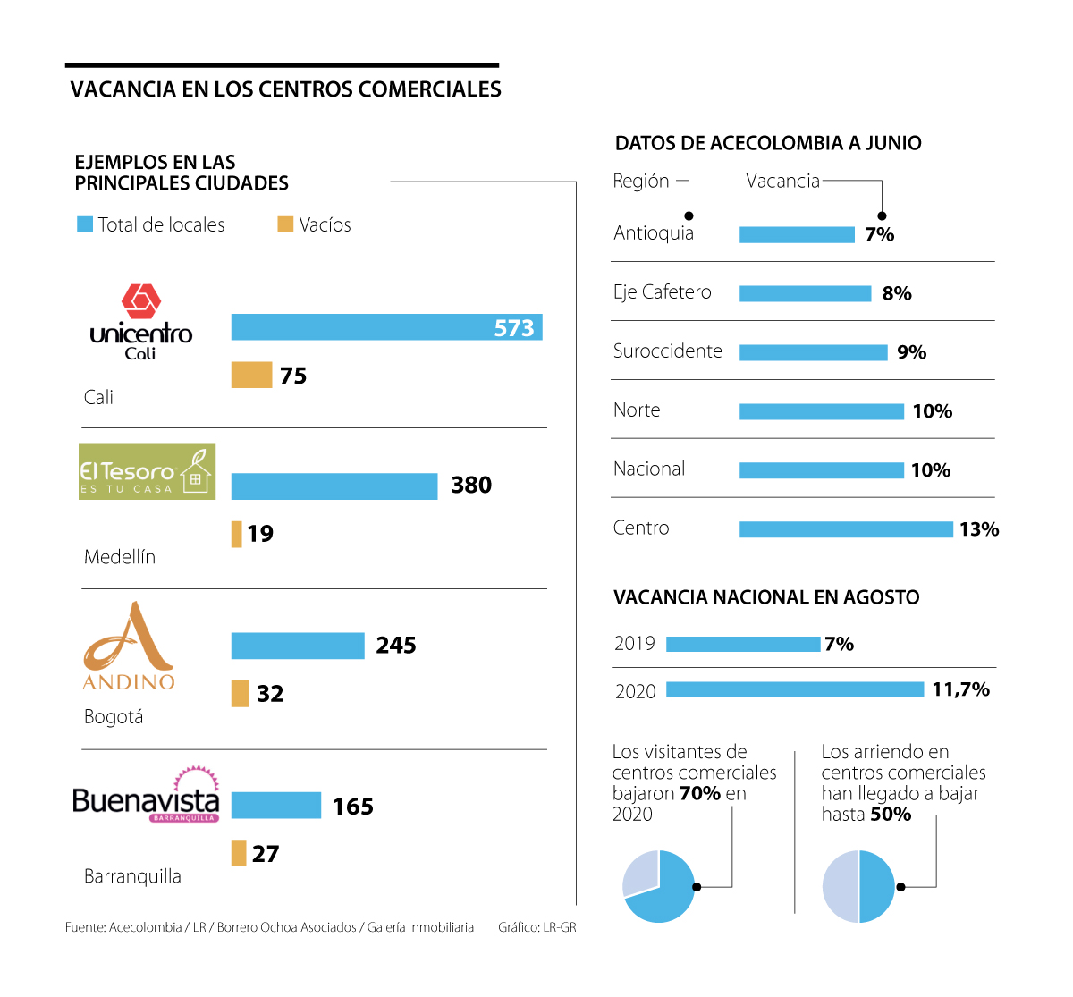 Con la reactivación económica que se dio paulatinamente en el país y se oficializó en septiembre, los índices de recuperación en el sector comercio cambiaron, por eso LR envió a sus periodistas en Medellín, Cali, Barranquilla y Bogotá para medir la vacancia en uno de los principales centros comerciales de cada ciudad.