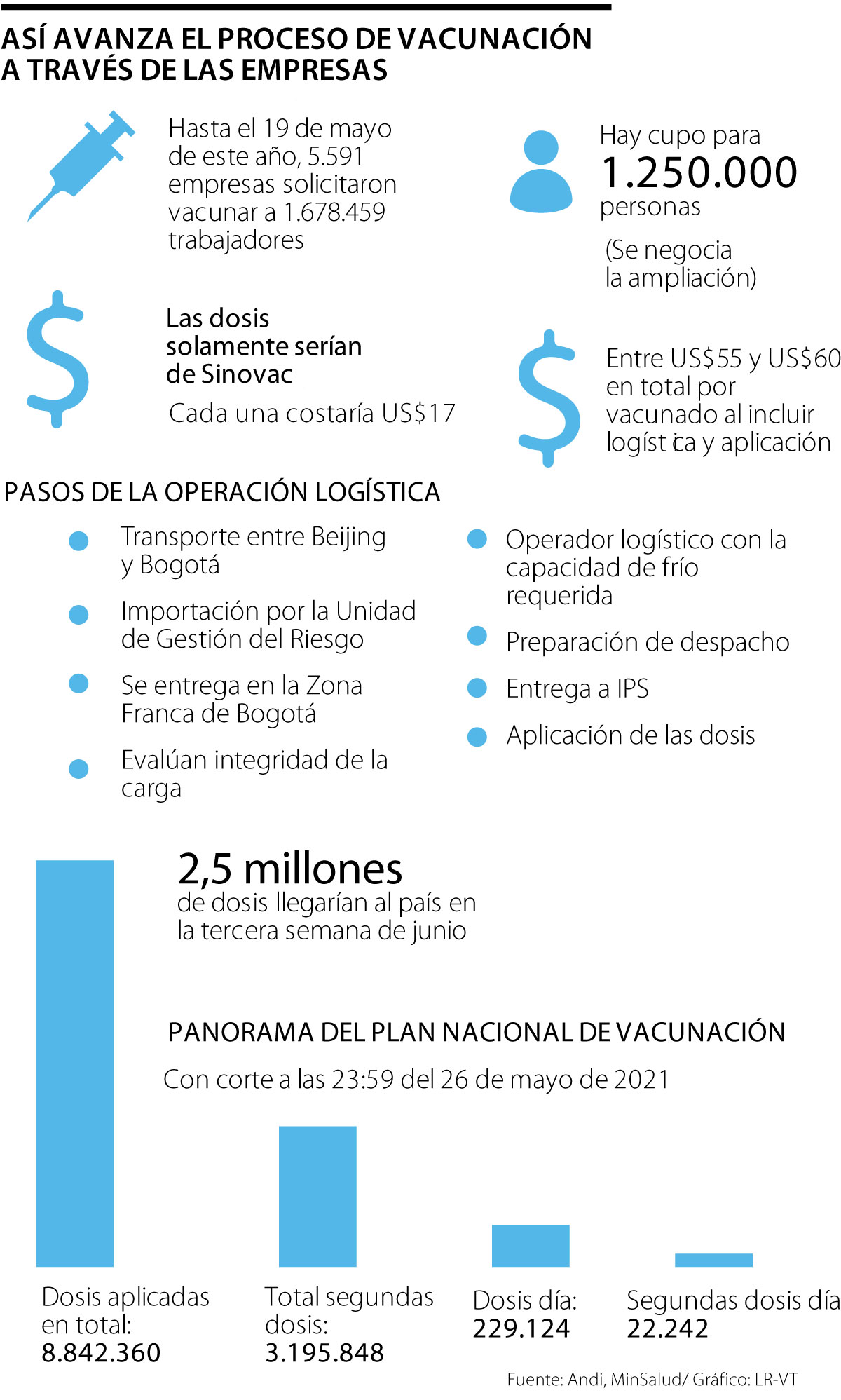 Es por esto que la Andi informó que, con corte al 19 de mayo, 5.591 empresas solicitaron vacunar a 1.678.459 trabajadores, sin embargo, solo hay cupo para 1.250.000 personas, por lo que se está tramitando con el Gobierno la posibilidad de ampliar el cupo disponible. De esto, se espera una respuesta la próxima semana.