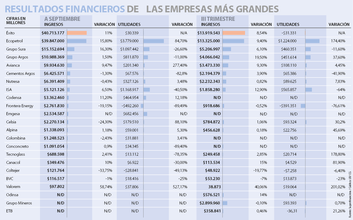 Aunque la economía todavía no crece al ritmo acostumbrado, el tercer trimestre del año mostró una mejor cara. Algunas muestras de ello, además del incremento de 2% en el PIB, son los resultados que tuvieron las compañías al cierre de septiembre. En el ranking por crecimiento en ventas anuales Valorem y Grupo Sura lideran con alzas de 58% y 15,8%, respectivamente.