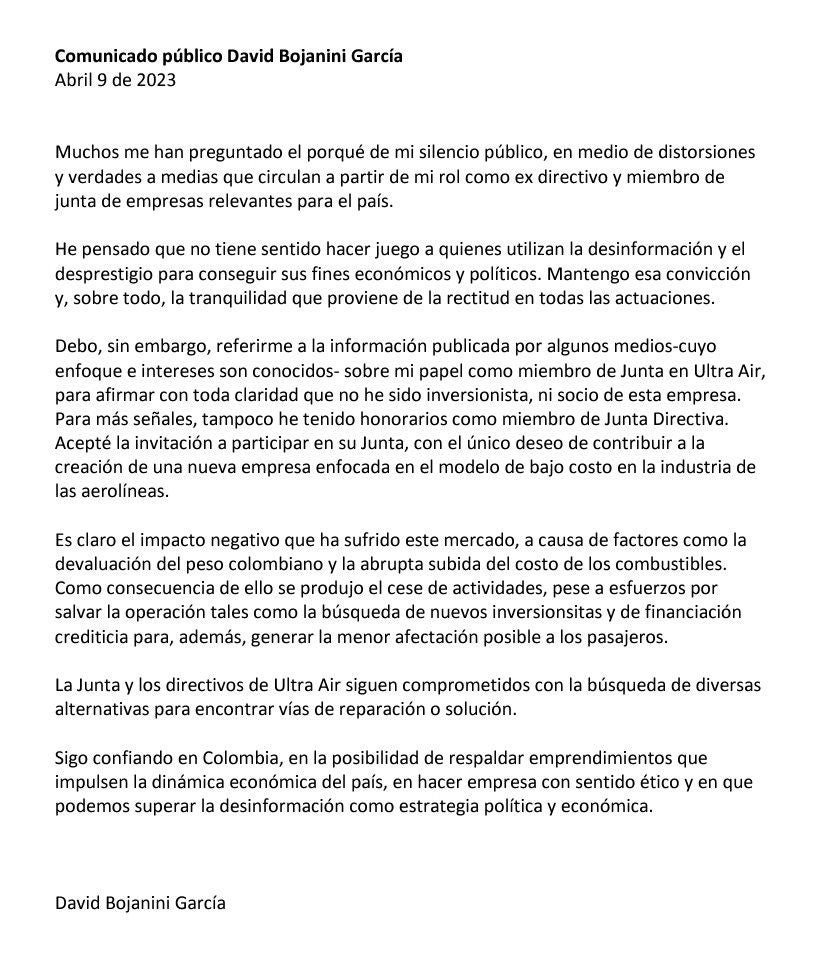 Además, asegura que "la Junta y los directivos de Ultra Air siguen comprometidos con la búsqueda de diversas alternativas para encontrar vías de reparación o solución. Sigo confiando en Colombia, en la posibilidad de respaldar emprendimientos que impulsen la dinámica económica del país, en hacer empresa con sentido ético y en que podemos superar la desinformación como estrategia política y económica".