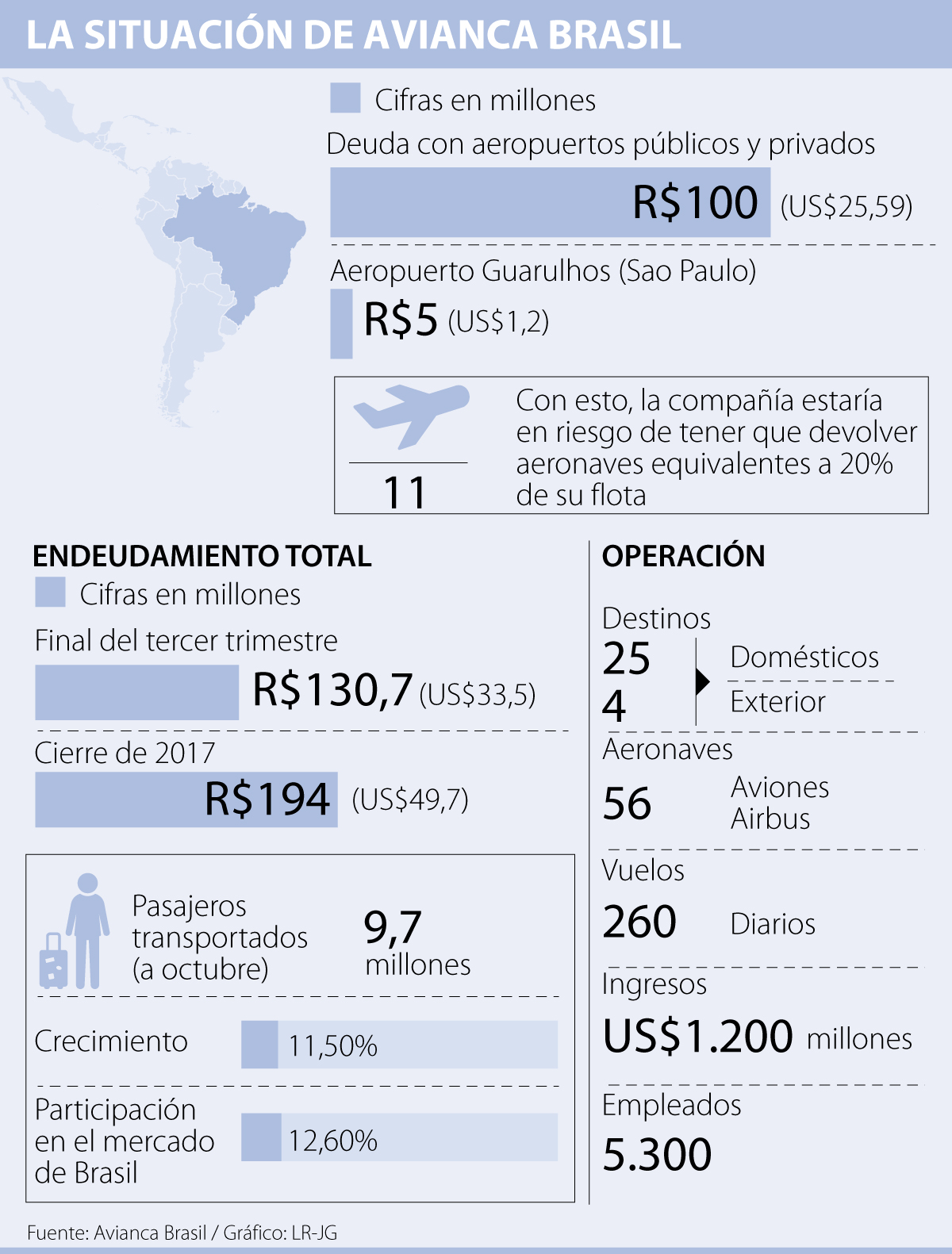 En cuanto al estado operacional de Avianca Brasil, las últimas cifras al corte de octubre, indican que el número de pasajeros fue de 9,7 millones de viajeros, esto es un alza de 11,5% frente al mismo período de 2017, mientras que las principales aerolíneas con las que compite (Azul, Gol y Latam Brasil) venían subiendo a niveles de un dígito, según Anac.