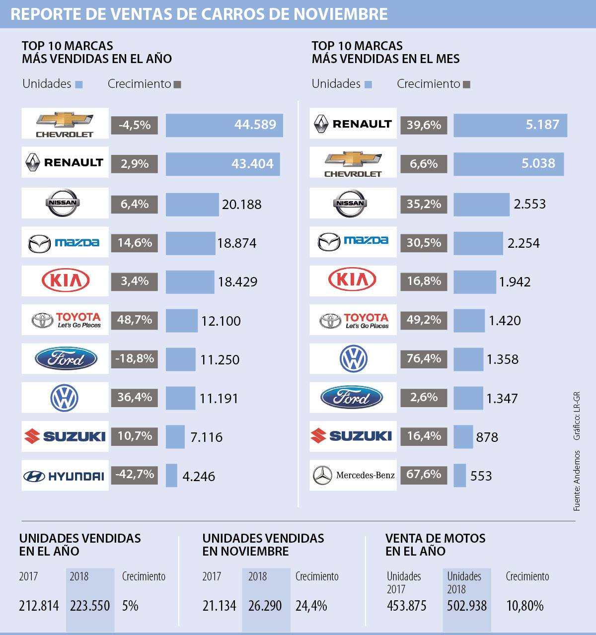 Las marcas líderes en las ventas acumuladas únicamente en noviembre fueron: Renault, con 5.187 unidades vendidas; y Chevrolet, que comercializó 5.038 nuevos carros. El tercer lugar lo ocupó Nissan, tras entregar 2.553 automotores durante el mes, mientras que el top cinco lo completaron Mazda y Kia, que despacharon 2.254 y 1.942 unidades durante el mes, respectivamente.