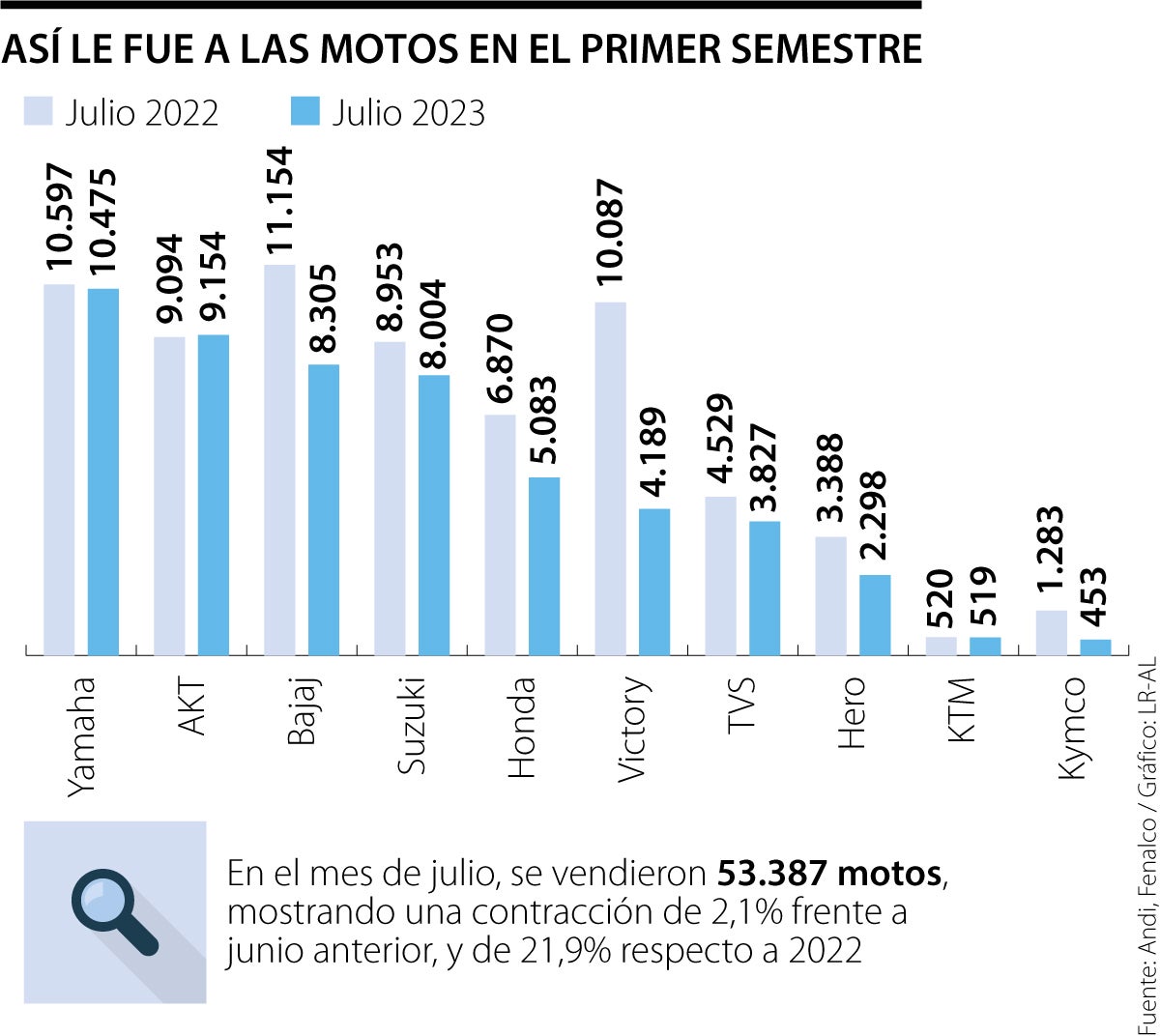 De acuerdo con el más reciente informe de julio, mostrado por la Asociación Nacional de Empresarios de Colombia, Andi, y la Federación Nacional de Comerciantes, Fenalco, las ventas de las motocicletas nuevas fue de 53.387, mostrando una contracción de 2,1% frente a junio y 21,9% con respecto al mismo mes de 2022.