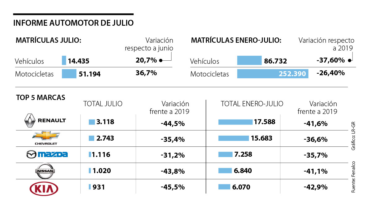 En cuanto a las cinco marcas con mayor número de matrículas en julio fueron: Renault, con una participación de mercado de 21,6%; seguida por Chevrolet, con 19,0%; Mazda, con 7,7%; Nissan, con 7,1%; y Kía que se llevó 6,4% del mercado. Estas marcas representan 61,8% del total de vehículos matriculados en julio.