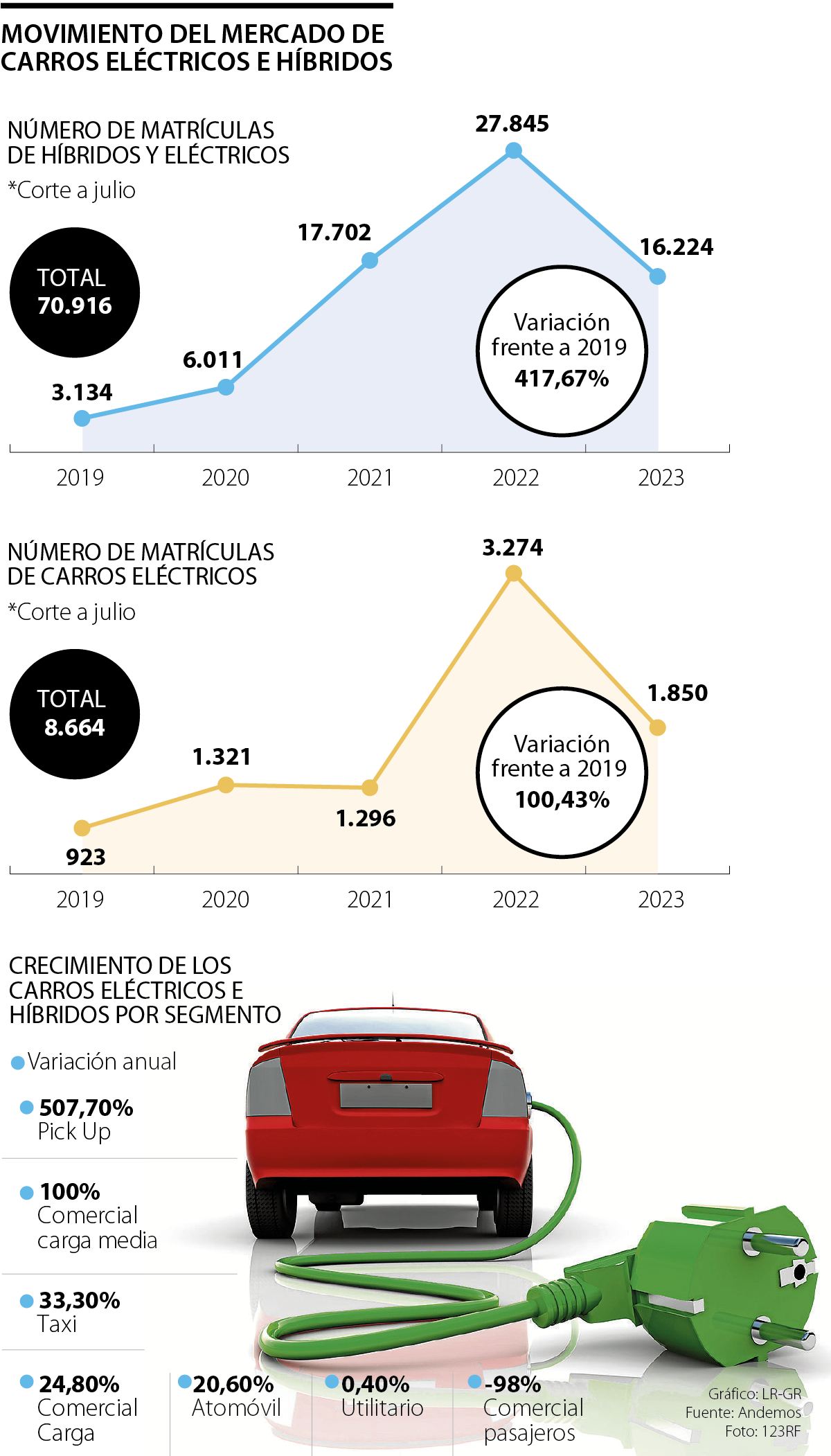 Estas cifras reflejan mayor incremento cuando se compara con los vehículos a combustión, debido a que este segmento ha decrecido, en medio de la crisis del sector que han mostrado la Andi y Fenalco, 197,46% entre 2019 y julio de 2023, ya que había registro de 260.550 y 87.591 respectivamente.