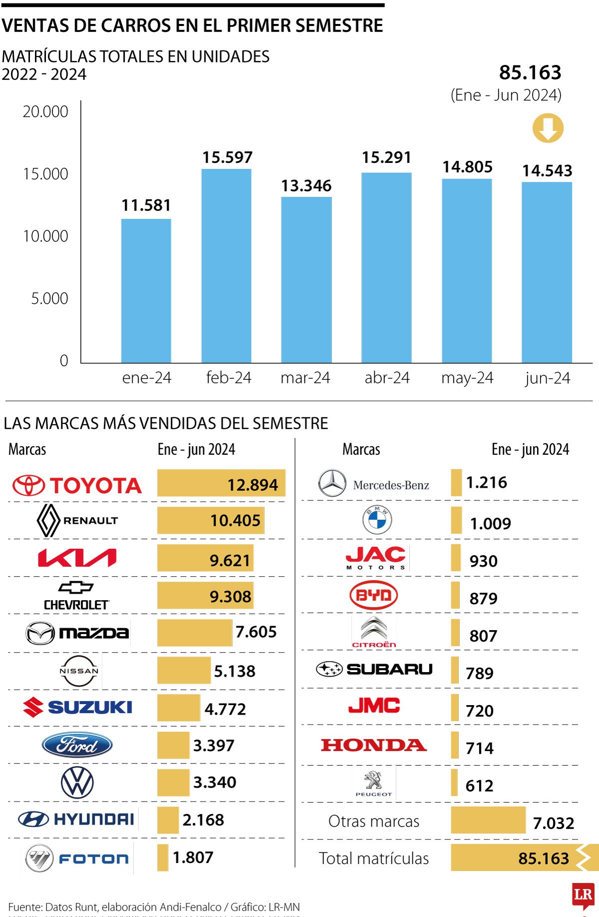 Aún así, hubo una mejora en las ventas de algunos meses, como por ejemplo, solo en junio, las matrículas nuevas se elevaron 1,2%, pasando de 14.364 carros en el sexto mes de 2023 frente a los 14.543 del mes pasado.
