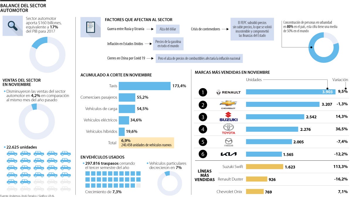 El gremio Andemos y la empresa de gas Vanti presentaron ayer un balance general del sector automotor en 2022. Calculan que este aporta $160 billones al año en Colombia, “equivalente al 17% del PIB para 2017”, según lo explicó el presidente de Andemos, Oliverio García, a partir del estudio desarrollado este año.