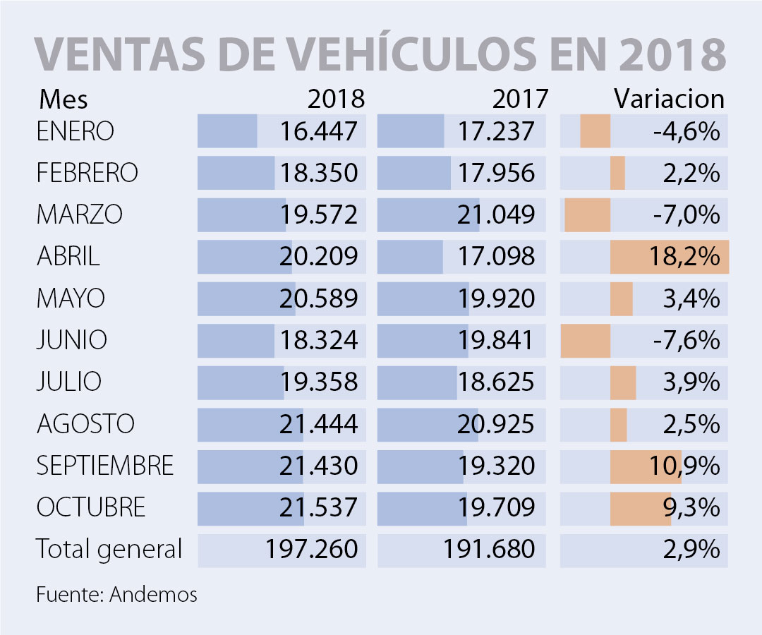 El más reciente reporte de ventas del sector automotor publicado por Andemos reveló que entre enero y octubre, se han comercializado 197.260 unidades, cifra que representó un crecimiento de 2,9% frente a las 191.680 que se vendieron en el mismo periodo de 2017.