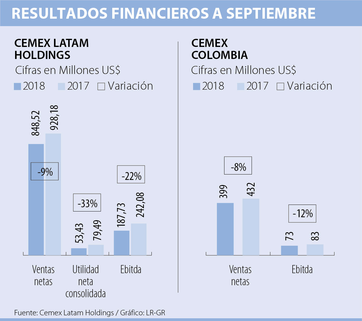 Cemex Latam Holdings presentó el informe de su rendimiento, tanto en el país como en el contexto regional, correspondiente al tercer trimestre del año, y en el mercado nacional se registró una caída en ventas de 8% a septiembre. Según el informe, en los primeros nueve meses del año la compañía facturó US$399 millones, cifra que en el mismo período del año anterior era de US$432 millones.