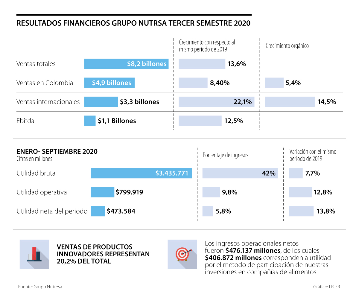 El Grupo Nutresa dio a conocer los resultados financieros del tercer trimestre del año, en los que reportan un crecimiento de 13,6% en las ventas consolidas a septiembre por $8,2 billones en todos sus mercados. El buen rendimiento, pese a la crisis del covid, es resultado de la innovación en los canales de venta.