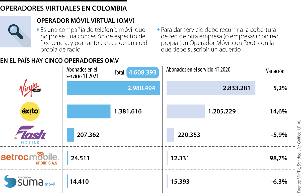 De acuerdo con datos de MinTIC, en Colombia existen cinco compañías que operan bajo la figura de OMV: Virgin, Móvil Éxito, Flash, Setroc y Suma.