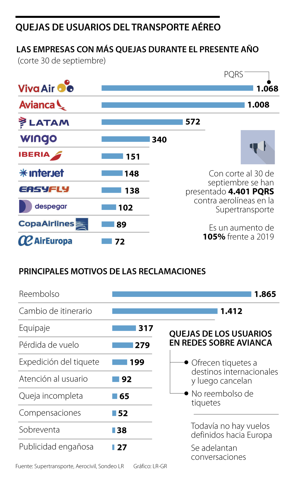 Varios usuarios de distintas aerolíneas se han quejado a través de redes sociales y señalan que no se han cumplido con los reembolsos y que Avianca vende tiquetes para vuelos internacionales, que luego cancela. Entre los denunciantes se encuentran el exalcalde de Bogotá, Enrique Peñalosa; y el jugador de fútbol Macnelly Torres. En el tema de las quejas de los usuarios, los líderes son Viva y Avianca, de acuerdo con datos de la Supertransporte.