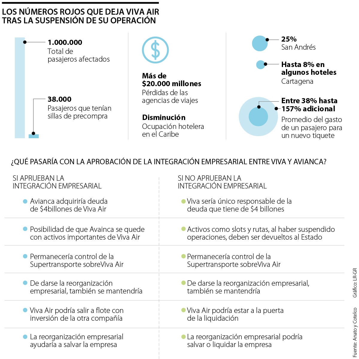 Pero también suspensión temporal implicaría un escenario diferente en el caso de que se apruebe la integración empresarial. Lo primero que resaltó Márquez Arango es que el hecho de que sea temporal significa que la empresa, que está en estado de coma con deudas que ascienden a $4 billones, no quiere morir. “Si es temporal es porque la sociedad quiere mantenerse ejecutando su objeto social. Si se aprueba la integración, pues lo que pasará es que Avianca querrá mantener a Viva en el mercado”, explica.