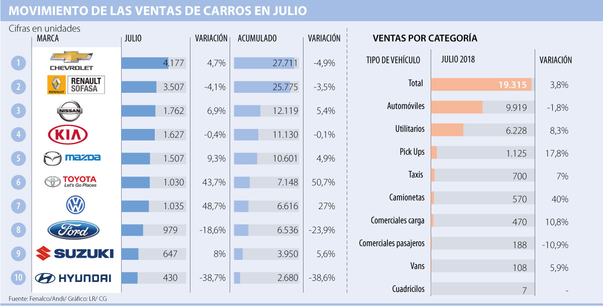 Si las ventas se observan en lo acumulado a julio, la marca que más ha crecido es Toyota, la cual duplicó lo registrado en 2017 para esta fecha. Al séptimo mes del año la marca ha vendido 7.148 unidades vendidas, un crecimiento de 50,7%.