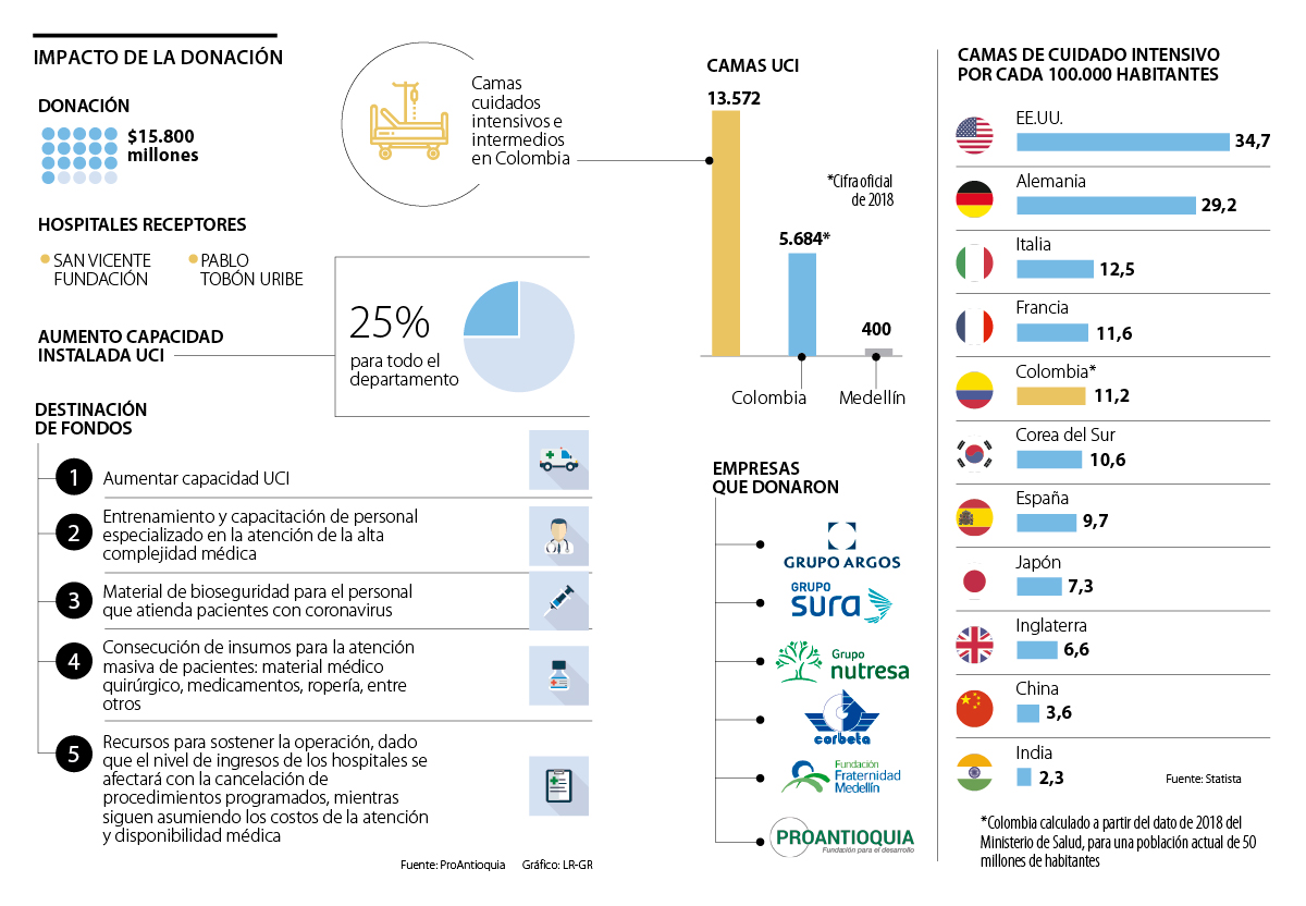 Con un primer aporte de $15.800 millones, la Fundación Grupo Argos, Grupo Sura y su Fundación, Grupo Nutresa, Colombiana de Comercio-Corbeta y la Fundación Fraternidad Medellín, con la articulación de Proantioquia, contribuyeron a la compra de equipos para dotar nuevas UCI en los Hospitales San Vicente Fundación y Pablo Tobón Uribe, en Medellín.
