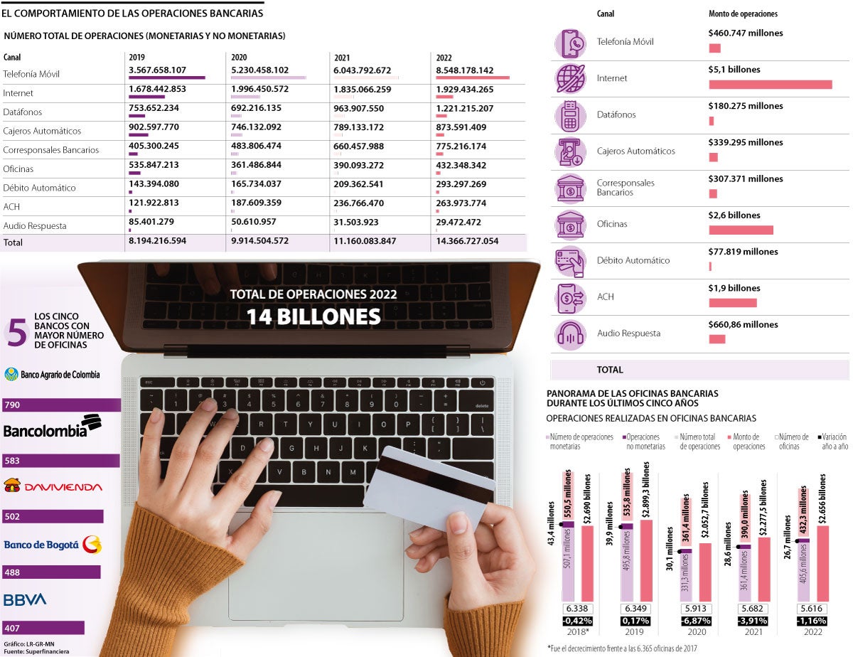 El canal de las oficinas, por otro lado, disminuyó en el mismo tiempo. En 2019 se realizaban al menos 535 millones de operaciones en los centros, mientras que en 2022 fueron 432 millones, lo que representó una caída de 19,25%.