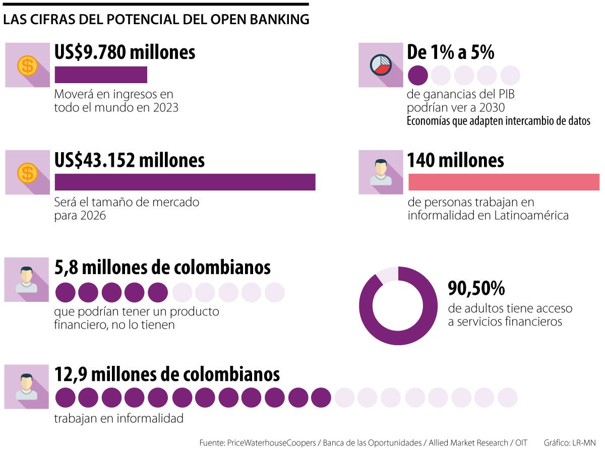 Reportes del sector apuntan a que esta modalidad moverá ingresos por US$9.780 millones al cierre de este año, según PriceWaterhouseCoopers. Por otro lado, para 2026 el tamaño del mercado alcanzará US$43.152 millones, según reporte de Allied Market Research. Y un análisis de McKinsey arroja que las economías que adopten el intercambio de datos para las finanzas podrían ver ganancias del PIB de entre 1% y 5% para 2030.