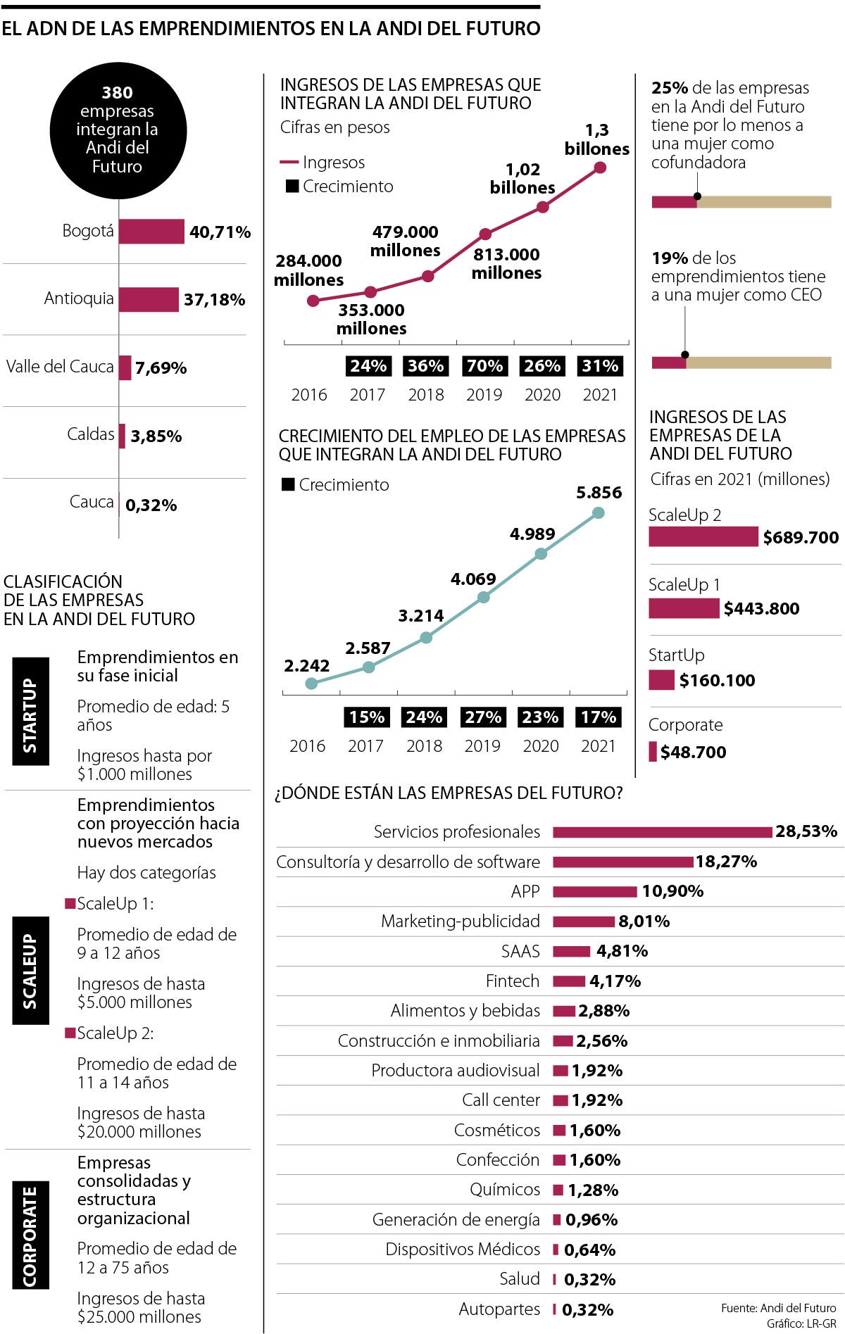 La Andi del Futuro fue creada con el propósito de potenciar la creación de empresas en Colombia. Actualmente, hay alrededor de 400 empresas o emprendimientos vinculados a esta iniciativa, empresas que en 2022 aportaron a la dinamización de la economía nacional generando más de $4 billones y generando 5.800 empleos. Su ritmo de crecimiento en la generación de empleo fue de 28%, superior a la tasa nacional (13% en 2021). Estas empresas pertenecen a casi 30 sectores económicos y operan en nueve regiones del territorio nacional.