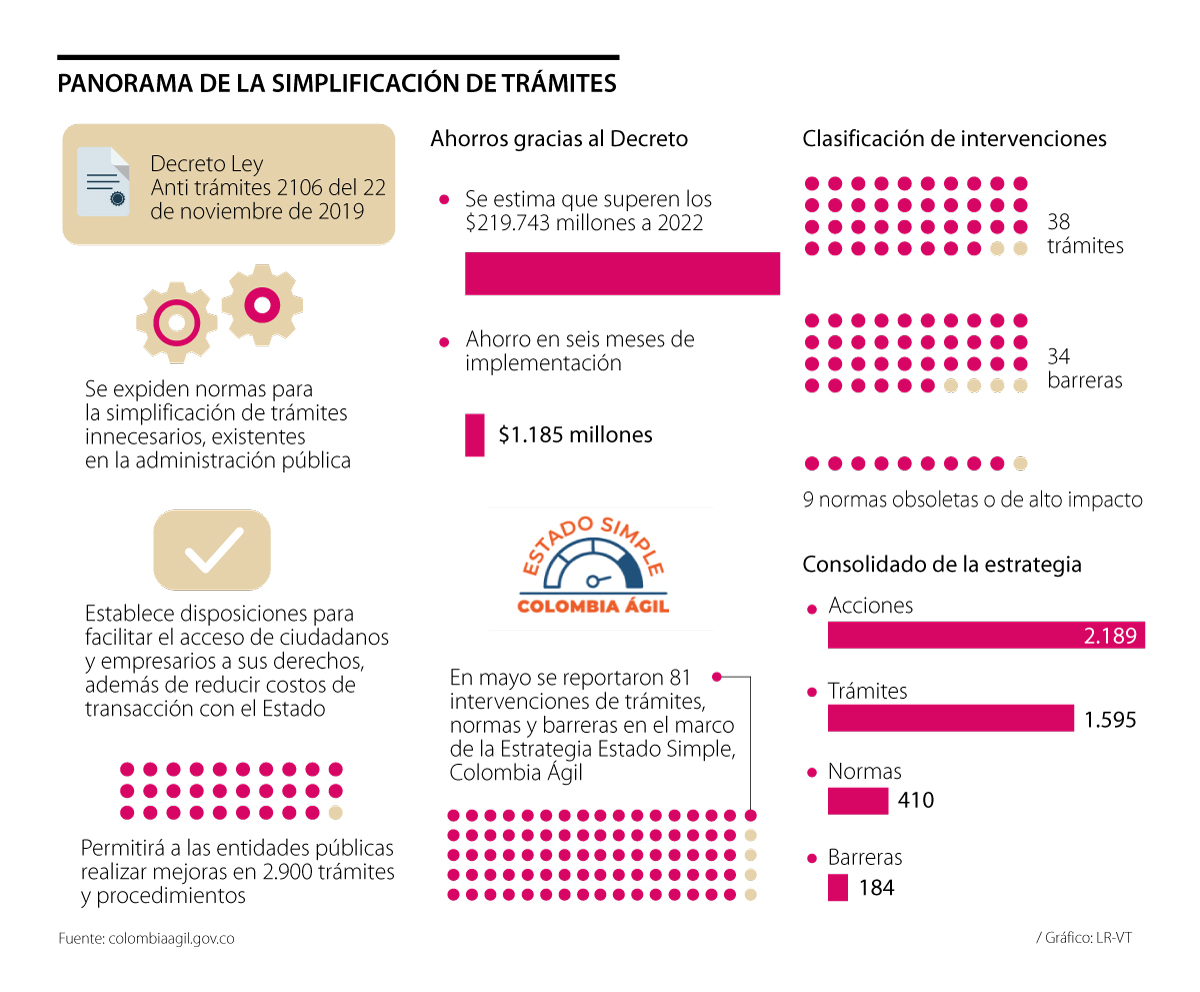Además, gracias a la estrategia Estado Simple, Colombia Ágil, que involucra la totalidad de las entidades del Estado, a la fecha se han intervenido 2.189 trámites, normas y barreras.