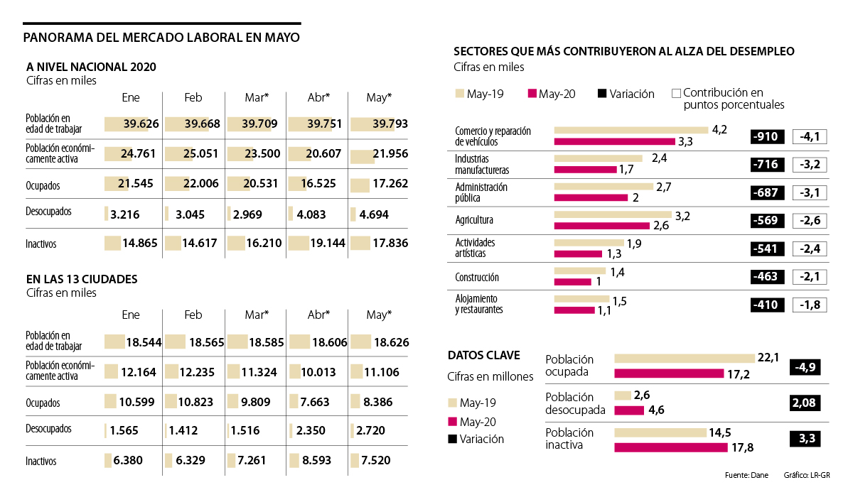 El efecto destructivo de la pandemia sobre el mercado laboral colombiano ha sido evidente. Solo en abril se registraron 5,3 millones de personas que perdieron su ocupación respecto al mismo mes del año anterior y, en mayo, la cifra fue de 4,9 millones, también comparando los resultados de la Encuesta Integrada de Hogares que hace el Dane, con los del quinto mes de 2019.