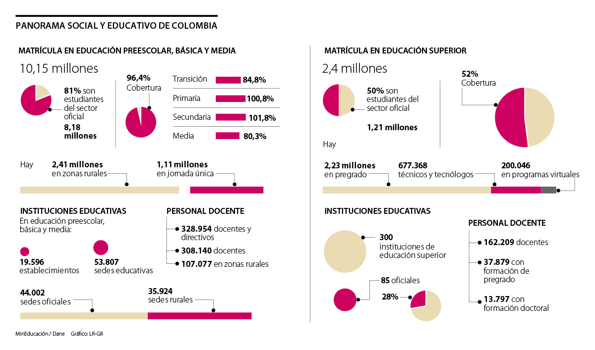 De acuerdo con el Ministerio de Educación, de 10,15 millones de niños que estaban matriculados el año pasado en educación preescolar, básica y media, 81% son estudiantes del sector oficial, 2,41 millones de niños en el país se concentran en zonas rurales y, a nivel general, la cobertura está en 96,4%.