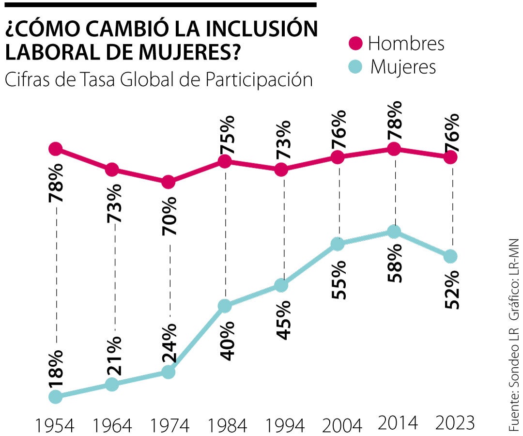 La inclusión laboral de las mujeres ha experimentado un cambio significativo. En 1954, la participación laboral femenina era de 18%, cifra que aumentó a 52% en 2023. Según un análisis del Banco de la República, durante el siglo XX, la fracción de mujeres en edad laboral que trabajan o buscan trabajo pasó del mencionado 18 % a 26% en 1978 y luego subió hasta 47% en 1992. Según los resultados, una de las transformaciones más significativas fue la transición demográfica. “Esta transición se atribuye principalmente a la disminución de la tasa de fecundidad asociada”, dice el informe.