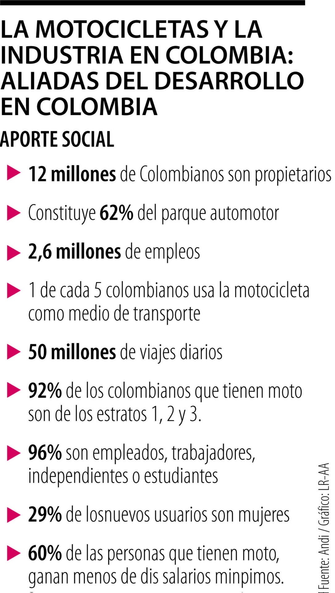 Teniendo en cuenta un estudio de la Asociación Nacional de Empresarios de Colombia, Andi, desarrollado, que analizó el parque automotor de este medio de transporte en Colombia, se pudo comprobar que el uso de la motocicleta en el país es trascendental, pues además de contar con un gran aforo de uso y compra, esto datos sirven de “aporte sustancial tanto en términos económicos como sociales de este transporte”.