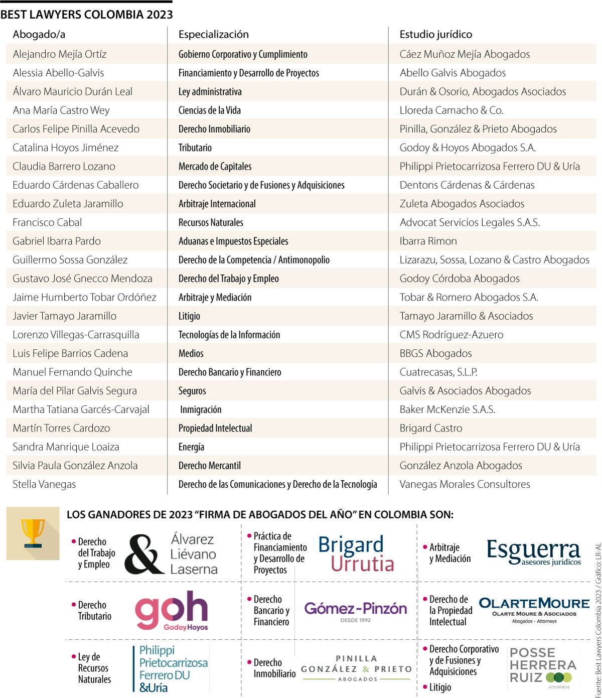 En este grupo de firmas del año entraron otros ocho bufetes que operan en Colombia y fueron: Álvarez Liévano Laserna, en el área de Derecho del Trabajo y Empleo; Brigard Urrutia, en Práctica de Financiamiento y Desarrollo de Proyectos; Esguerra Asesores Jurídicos, en Arbitraje y Mediación; Godoy & Hoyos Abogados, en Derecho Tributario; Gómez-Pinzón, en Derecho Bancario y Financiero; OlarteMoure & Asociados, en Derecho de la Propiedad Intelectual; Philippi Prietocarrizosa Ferrero DU & Uría, en Ley de Recursos Naturales; y Pinilla, González & Prieto Abogados, en Derecho Inmobiliario.