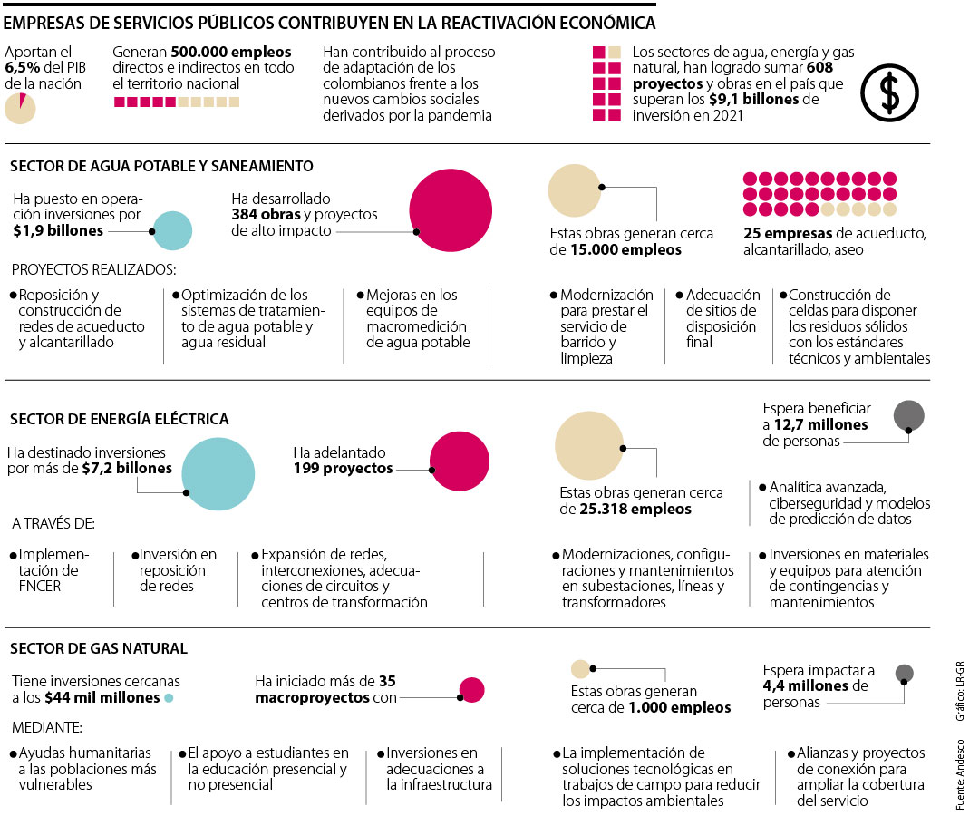 Las empresas de servicios públicos domiciliarios han jugado un papel fundamental en la reactivación económica que está experimentado Colombia tras la pandemia del covid 19. Al menos el 6,5% del PIB de la Nación estaría siendo aportado por empresas pertenecientes al sector y alrededor de 500.000 empleos directos e indirectos en todo el territorio nacional dependen de las compañías.
