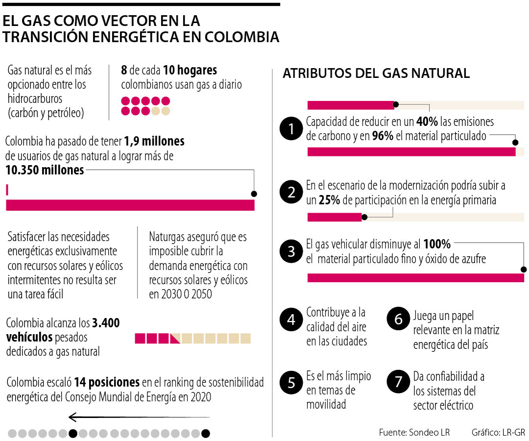 El Ministerio de Minas y Energía explicó que el gas natural es aclamado como el combustible de transición de los hidrocarburos a las energías renovables por su capacidad de reducir en 40% las emisiones de carbono y en 96% el material particulado. A esto se suma, que es el más limpio en temas de movilidad, razón por la que se han emitido distintas resoluciones para reglamentar los combustibles de bajas emisiones.