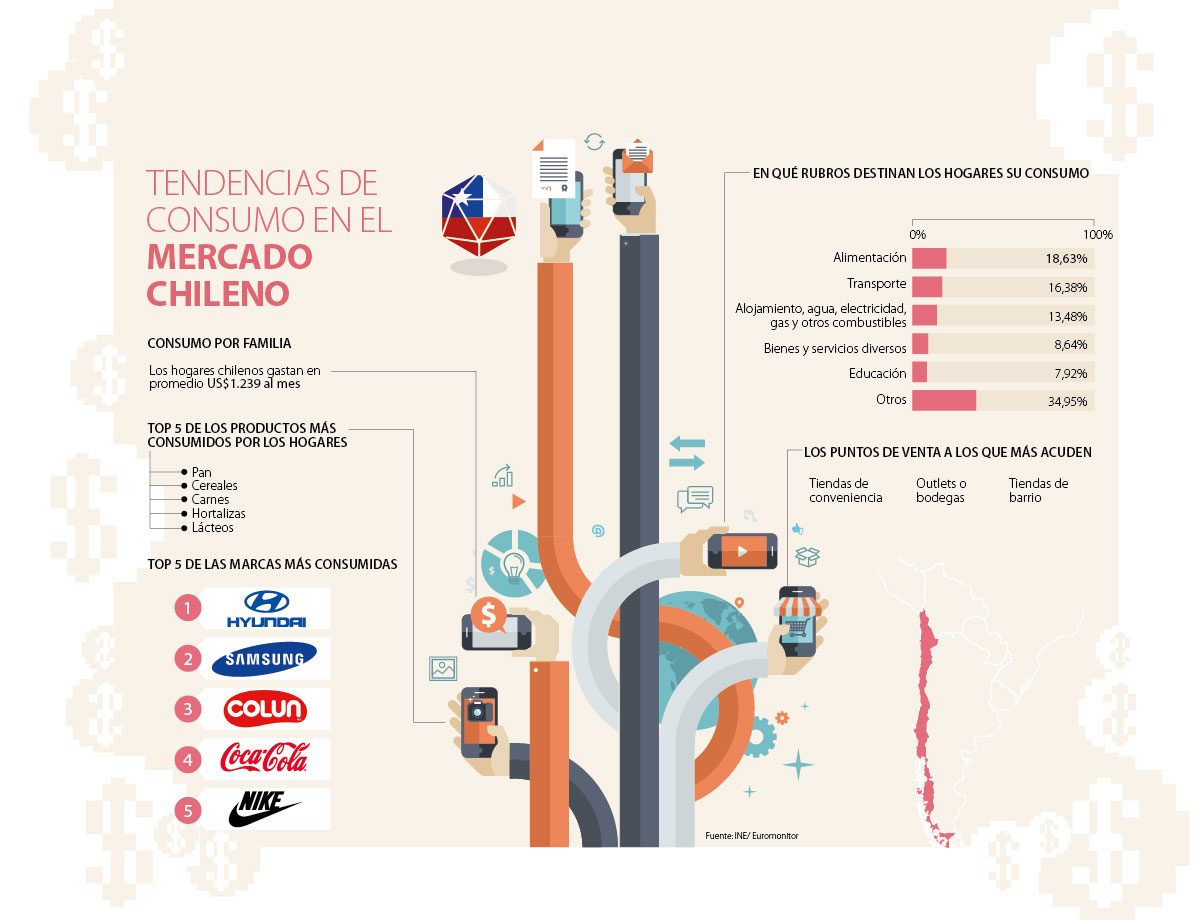 Un hogar chileno promedio está conformado por tres personas que al mes gastan cerca de US$1.239. Los alimentos son los que se llevan la mayor parte del ingreso, pues se estima que en este rubro se invierte 18,6% del presupuesto familiar mensual. Los otros gastos con mayor incidencia son el transporte y servicios como alojamiento, agua, electricidad, gas y demás combustibles, con una participación de 16,3% y 13,4%, respectivamente.