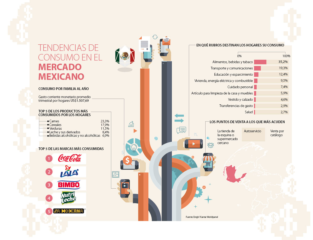 Así mismo, las cinco marcas más consumidas en México son de alimentos y bebidas. Según el informe Brand Footprint de Kantar Worldpanel, las favoritas de las familias mexicanas son Coca-cola, Lala, Bimbo, Nutri Leche y La Moderna. Según este reporte, Coca-cola es elegida por 98,7% de los hogares, que compraron sus productos, en promedio, 78,94 veces en el año. En cambio, La Moderna es elegida por 84,9% de los hogares, que compraron algunos de sus productos, en promedio, 20,4 veces durante 2016.